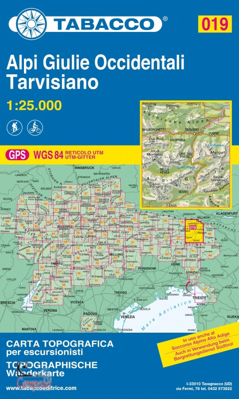 | Alpi Giulie Occidentali - Tarvisiano Carta Topografica per escursionisti con reticolo chilometrico U.T.M. Canin - Sella Nevea - Montasio - Jof Fuart - Jof di Miezegnot - Grintavec - Jalovec - Mangart - Ponze - Fusine - Ostering | |