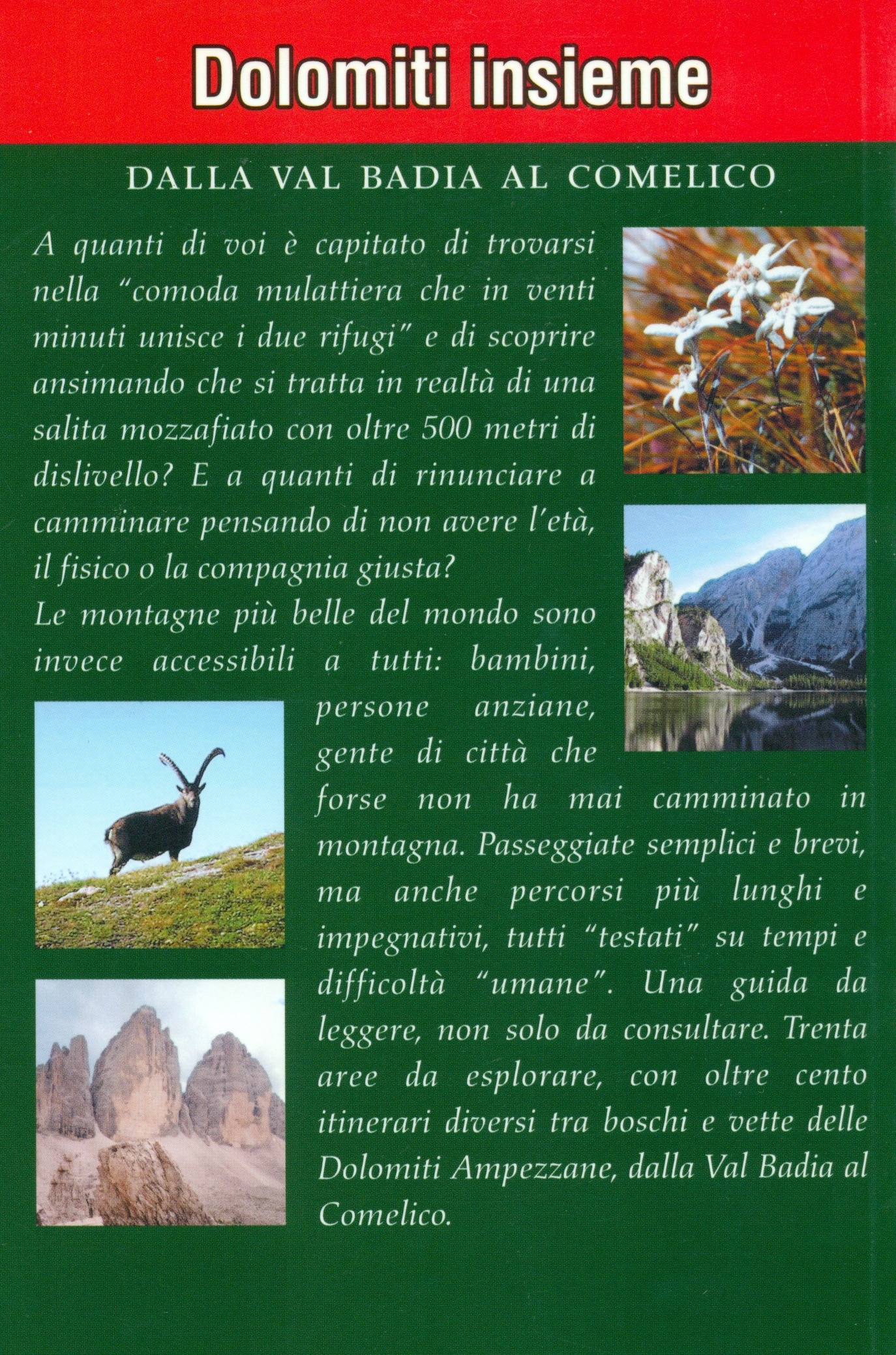 | DOLOMITI INSIEME, Escursioni per tutti tra i boschi e le vette nei dintorni di Cortina d'Ampezzo "A quanti di voi è capitato di trovarsi nella 'comoda mulattiera che in venti minuti unisce i due rifugi' e di scoprire ansimando che si tratta in realtà di una salita mozzafiato con oltre 500 metri di dislivello? E a quanti di rinunciare a camminare pensando di non avere l'età, il fisico o la compagnia giusta? Le montagne più belle del mondo sono invece accessibili a tutti: bambini, persone anziane, gente cittadina che non ha mai camminato in montagna. Passeggiate semplici e brevi, ma anche percorsi più lunghi e impegnativi, tutti 'testati' su tempi e difficoltà 'umane'." | |