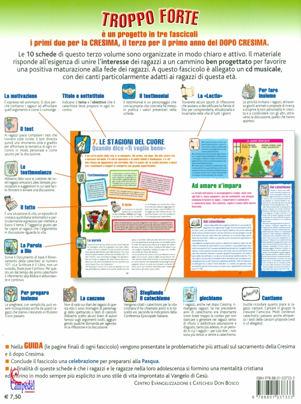 | Ultimo di tre fascicoli che costituiscono un progetto di catechesi in preparazione alla Cresima (i primi due) e per il primo anno del dopo Cresima (il terzo) Questo fascicolo è formato da 10 schede organizzate in modo chiaro e attivo Il materiale risponde all'esigenza di unire l'interesse dei ragazzi a un cammino catechistico corretto e ben progettato per favorire una loro positiva maturazione alla fede, sulla base della Parola di Dio e con continui riferimenti ai catechismi "Sarete miei testimoni" e "Vi ho chiamato amici" Le ultime pagine del fascicolo costituiscono la guida per i catechisti, in cui vengono presentate le problematiche più attuali della Cresima, e inoltre indicazioni per giochi e attività, testimonial, lettere ai genitori Infine, una celebrazione per aiutare i ragazzi a vivere la Pasqua Con allegato un cd musicale: 10 canzoni per accompagnare gli incontri | |