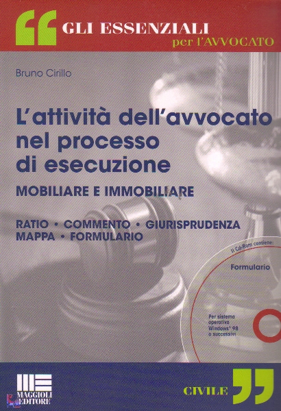 | "Gli Essenziali per l'avvocato" Si è cercato di studiare, il giusto equilibrio tra l'esigenza di avere subito a disposizione le nozioni indispensabili di dottrina e giurisprudenza e un modello come esempio operativo Nella struttura come primo elemento si trova la RATIO che indica la fonte normativa delle questioni trattate, segue poi il commento sostanziale con riferimenti dottrinari e al diritto vivente, a volte suddiviso in sezioni specifiche evidenziate in carattere maiuscolo per meglio focalizzare alcuni aspetti della tematica E poi ancora, la GIURISPRUDENZA che raccoglie una rassegna delle massime più interessanti e recenti riguardo agli aspetti giuridici coinvolti Poi segue la MAPPA, di immediata comprensione, che, impostata graficamente come "diagramma di flusso", raccoglie "l'essenziale" di quanto detto nel commento, Infine troviamo la FORMULA quale modello da personalizzare secondo le proprie esigenze (sul Cd-Rom allegato è presente l'intero formulario editabile e stampabile) |