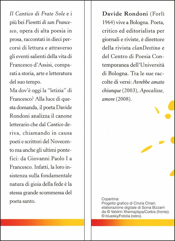 | Il Cantico di Frate Sole e i più bei Fioretti di San Francesco, opera di alta poesia in prosa, raccontati in dieci percorsi di lettura e attraverso gli eventi salienti della vita di Francesco d'Assisi, comparati a storia, arte e letteratura del suo tempo. Ma dov'è oggi la ''letizia'' di Francesco? Alla luce di questa domanda, il poeta Davide Rondoni analizza il canone letterario che dal Cantico deriva, chiamando in causa poeti e scrittori del Novecento ma anche gli ultimi pontefici: da Giovanni Paolo I a Francesco. Infatti, la loro insistenza sulla fondamentale natura di gioia della fede è la stessa grande scommessa del poeta santo. | |