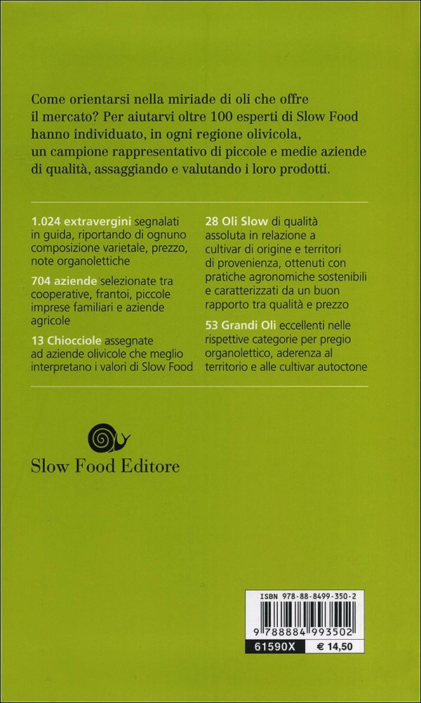| A pochi mesi dalla raccolta delle olive e dalla loro spremitura, ritorna il repertorio che ogni anno Slow Food dedica a uno dei prodotti simbolo della cultura mediterranea. 130 esperti assaggiatori hanno percorso l'Italia alla ricerca delle aziende agricole e dei frantoi dove si producono gli oli migliori, valutandone non solo i pregi organolettici ma la corrispondenza a criteri di valorizzazione delle cultivar autoctone e di sostenibilitą delle pratiche agronomiche. Di ogni prodotto si riportano tipologia, composizione varietale, prezzo e risultati dell'analisi sensoriale. Simboli specifici segnalano i Grandi Oli, gli Oli Slow e le aziende meritevoli di Chiocciola. | |