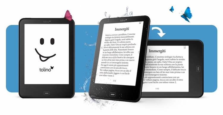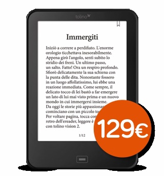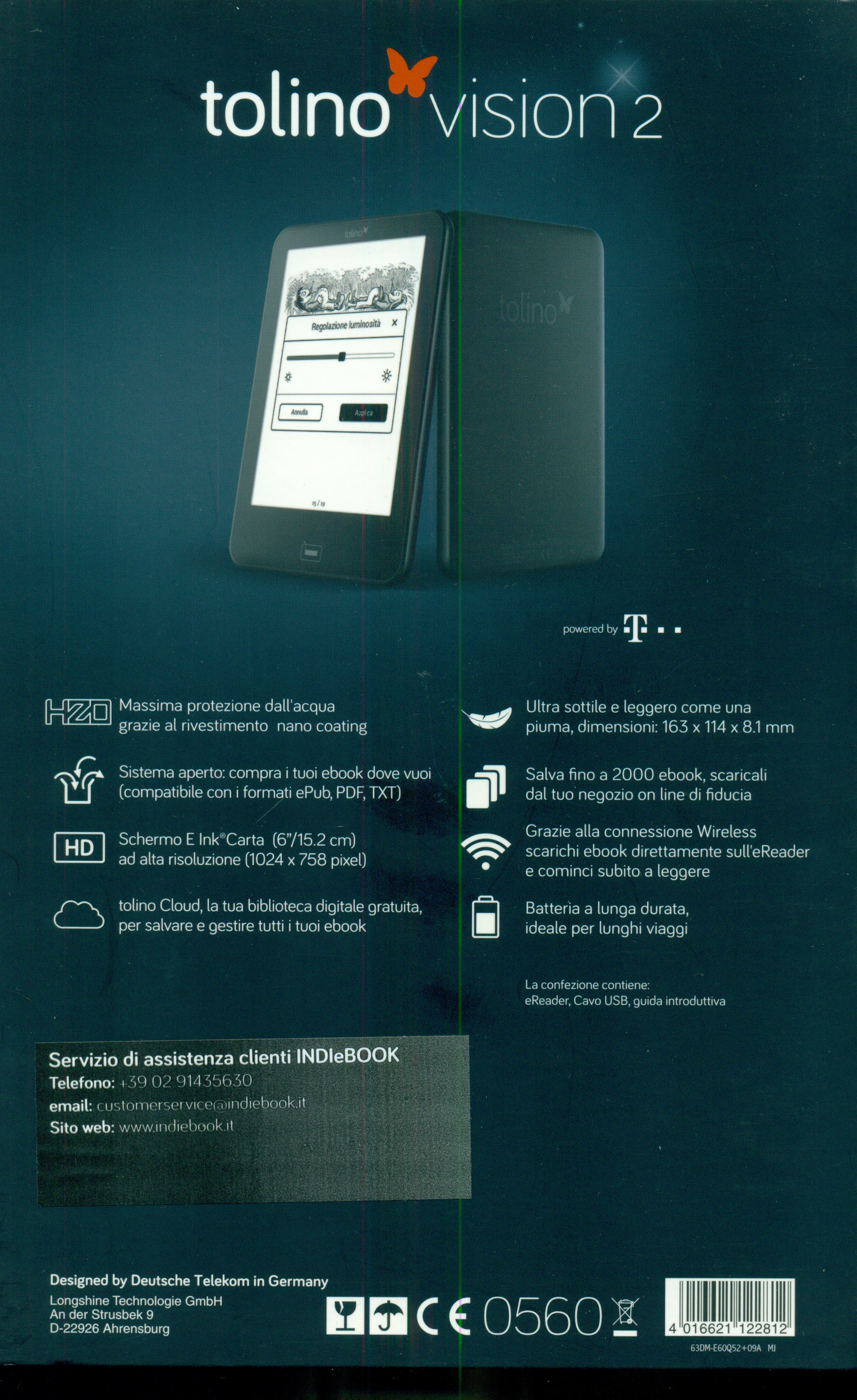 Schermo E Ink®Carta con trattamento antiriflesso Illuminazione integrata regolabile Resistente all'acqua: rivestimento nanocoating Tap2Flip: innovativo sistema per sfogliare le pagine Pinch to zoom: ingrandisci testo e immagini Processore 1 GHz Tolino vision 2 è l'eReader per chi cerca un elevato comfort di lettura. Schermo in alta definizione, con antiriflesso e illuminazione integrata per leggere anche al buio, tecnologia REGAL che elimina ogni traccia d'inchiostro della pagina precedente: un'elevata qualità tecnologica in un dispositivo ultra sottile e leggero. Tolino vision 2 è anche resistente all'acqua: grazie alla tecnologia HzO Waterblock Come sulla carta Il display di ultima generazione E Ink®Carta rende ancora più nitido il contrasto sulla pagina. La Tecnologia Anti Ghosting (REGAL) elimina ogni ombra e traccia della pagina precedente. Tap2Flip Tap2Flip è l'innovativo sistema per sfogliare le pagine del to lino vision 2. Basta un semplice tocco sul retro del dispositivo per passare alla pagina successiva. È più facile: leggi con una mano sola mentre passeggi al parco con il cane, mentre viaggi in affollati mezzi pubblici, oppure quando sei comodamente sdraiato sul tuo divano. Elevato comfort di lettura Il touchscreen capacitivo permette di sfogliare le pagine più facilmente con un leggero tocco dello schermo. Grazie al pinch to zoom ingrandisci e rimpicciolisci facilmente testi e immagini con un semplice movimento delle dita. Leggi i tuoi eBook anche in modalità orizzontale Resistente all'acqua Tolino vision 2 è anche resistente all'acqua: grazie alla tecnologia HzO Waterblock® tutti le componenti del dispositivo sono protette. Puoi quindi leggere tranquillamente e concederti un bagno caldo rilassante in compagnia di un buon libro. Veloce e performante Il potente processore del tolino Vision 2 velocizza tutte le operazioni, dall'avvio all'apertura di un eBook. Sfogliare le pagine ed effettuare una ricerca nel testo è ancora più rapido. Un piccolo grande libro Leggero e sottile (8.1 millimetri) pesa meno di un libro tascabile. Non occupa molto spazio nella borsa o nella giacca, ma è capace di contenere una grande biblioteca digitale: fino a 2000 libri nella tua mano! Ogni momento è buono per leggere Non ti serve una lampada sul comodino per leggere anche al buio. L'illuminazione integrata facilment e regolabile consente di leggere con qualsiasi luce, senza alcuna fatica per la vista. Tolino Cloud Tolino Cloud è il nuovo spazio a tua disposizione per archiviare non solo libri ma anche qualunque documento utile alla tua vita quotidiana, dai file per il lavoro alle istruzioni degli elettrodomestici di casa. Tutti gli acquisti effettuati su indiebook.it vengono automaticamente salvati nel tuo spazio protetto e sicuro: potrai così scaricarli in qualsiasi momento tramite connessione WiFi. tolino Cloud ti terrà il segno, sincronizzando la lettura su tutti i tuoi dispositivi. Scegli, acquista, DOVE VUOI Hai completa libertà di scelta: potrai caricare sul tuo tolino anche gli eBook acquistati in altri negozi che utilizzano i formati standard, inoltre puoi scaricare e trasferire i tuoi libri e documenti personali nei formati compatibili (ePub, PDF e TXT). Ulteriori informazioni: https://www.indiebook.it/fat/fatlto.aspx | |