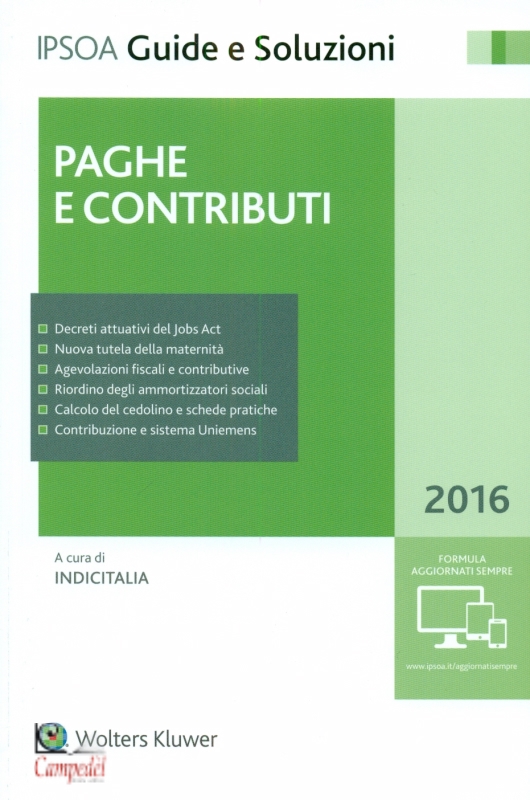 Il Manuale PAGHE E CONTRIBUTI 2016, inserito nella collana GUIDE E SOLUZIONI, è dedicato ai professionisti del lavoro ed è diretto ad affiancare e supportare l’attività degli addetti paga nell’elaborazione e nella compilazione dei cedolini. Paghe e contributi esamina con taglio operativo gli adempimenti sia di fonte legale che contrattuale connessi al personale dipendente e non. L’esposizione sistematica degli obblighi derivanti sia dalla disciplina normativa che dalla prassi amministrativa offre al lettore un completo quadro d’insieme della materia ed è accompagnata dalle istruzioni operative e dall’indicazione di soluzioni applicative in ordine all’elaborazione degli stipendi, alla determinazione dei contributi previdenziali, dei premi assicurativi e delle ritenute fiscali. Tra le novità di questa edizione oltre alla completa revisione del quadro normativo generale, vanno segnalate le modifiche apportate dalla legge di Stabilità 2016 (L. 28/12/2015, n. 208), con la quale sono stati ulteriormente previsti interventi in tema di esonero contributivo, premi di produttività, nuove misure a sostegno del reddito, lavoro autonomo e conciliazione vita-lavoro, nuovo regime forfetario per professionisti ed imprese, misure previdenziali e settima salvaguardia per esodati, infine carta famiglia interventi per arte e cultura. | |