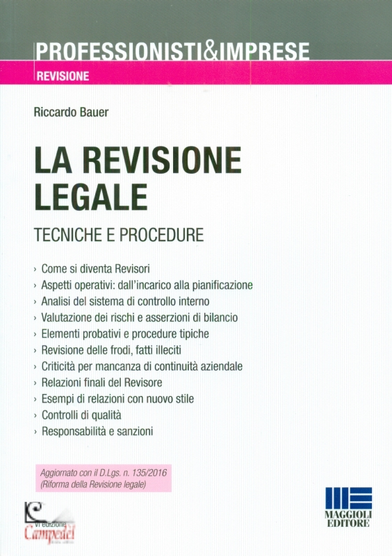 -Come si diventa Revisori -Aspetti operativi: dall’incarico alla pianificazione -Analisi del sistema di controllo interno -Valutazione dei rischi e asserzioni di bilancio -Elementi probativi e procedure tipiche -Revisione delle frodi, fatti illeciti -Criticità per mancanza di continuità aziendale -Relazioni finali del Revisore -Esempi di relazioni con nuovo stile -Controlli di qualità -Responsabilità e sanzioni Aggiornato con il D.Lgs. n. 135/2016 (Riforma della Revisione legale) Il manuale offre una panoramica esaustiva delle principali caratteristiche della revisione legale, proponendo un “percorso” logico e lineare per svolgere gli incarichi da parte sia di un collegio sindacale (o di un sindaco unico) sia di una società di revisione. Al contempo, il volume rappresenta uno strumento operativo, grazie a numerosi esempi di documentazione, questionari e metodi per affrontare l’analisi critica dell’informativa contabile. Q uesta sesta edizione è aggiornata con le profonde modifiche introdotte dal D.Lgs. n. 135/2016, che ha riscritto gran parte del D.Lgs. 39/2010, incidendo significativamente sui ruoli e sui compiti degli organi di controllo, dei collegi sindacali e dei consigli di amministrazione. | |