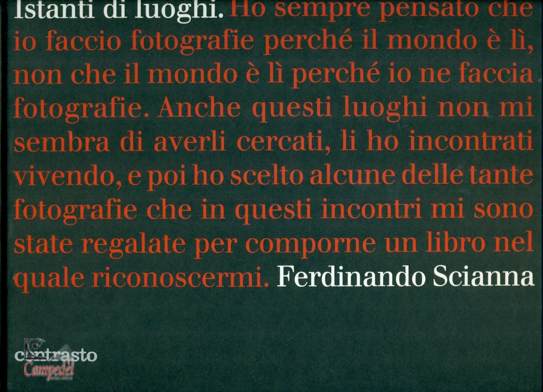 "Non mi considero un fotografo paesaggista. Nemmeno un fotografo ritrattista, o un fotografo di moda. Nemmeno soltanto un fotogiornalista. Anche se a queste pratiche artigianali ho dedicato per cinquanta anni, e quasi altrettanti libri, il mestiere della mia vita. Meno che mai mi considero un fotografo artista. Ho cercato di essere un fotografo, un reporter, e spero che come tale mi si consideri. Negli ultimi anni ho soprattutto fatto libri in cui ho accompagnato le mie fotografie con testi e memorie. Ho vo luto con questo, senza che cambiasse in nulla il senso e l'obiettivo, proporre un racconto di sole immagini. In definitiva, per mezzo secolo, ho fatto il fotografo. Fotografo è per me uno che usando lo strumento della fotografia guarda il mondo, lo incontra, e cerca di vederlo e raccontarlo. Anche questo libro si definisce per quello che indica il titolo: Istanti di luoghi. Nella mia vita ho incrociato uomini, storie, luoghi, animali, bellezze, dolori, che mi hanno suscitato, come persona e come fotografo, emozioni, pensieri, reazioni formali che mi hanno imposto di fotografarli, di conservarne una traccia. Ho sempre pensato che io faccio fotografie perché il mondo è lì, non che il mondo è lì perché io ne faccia fotografie. Anche questi luoghi non mi sembra di averli cercati, li ho incontrati vivendo, e poi ho scelto alcune delle tante fotografie che in questi incontri mi sono state regalate per comporne un libro nel quale riconoscermi. Fare libri è stato, mi sembra, l'obiettivo principale di tutto il mio fotografare. Tentativi di sintesi, questi libri, nei quali cerco di consegnare e comunicare la passione per la realtà e per la vita." (Ferdinando Scianna) | |