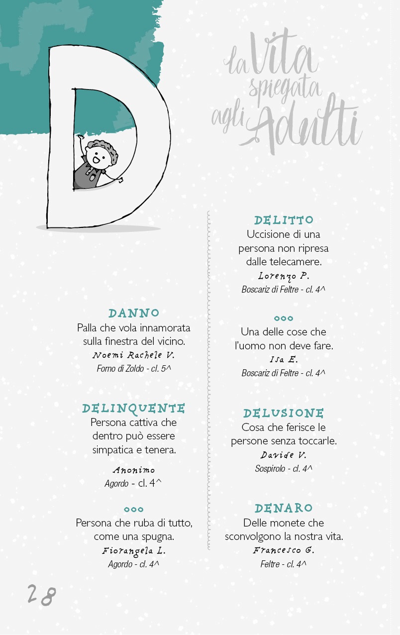 I bambini spiegano la vita agli adulti: valori, sentimenti, emozioni, oggetti e comportamenti quotidiani. Tutti descritti in un vero e proprio vocabolario attraverso cui – lemma per lemma – i più grandi possono scoprire che la realtà, guardata con gli occhi dei più piccoli, diventa più semplice. Più bella. La vita spiegata agli adulti, fresco di stampa per Edizioni DBS, nasce grazie all’Associazione Pomi d’Ottone di Belluno. Per oltre un anno, in collaborazione con l’attrice Cristina Gianni, i volontari sono entrati nelle classi elementari di tutta la provincia di Belluno chiedendo ad oltre 500 bambini di aiutarli a scrivere un vocabolario e ricevendo da ciascuno definizioni di parole. Racconta Cristina: “ Al termine di ogni sessione di definizioni, che solitamente durava trenta minuti, ci si sedava in cerchio e si condividevano le idee più interessanti ed originali. Questi momenti di scambio sono particolarmente importanti, perché emergeva chiaramente come ogni vocabolo fosse ricco di suggestioni e di immagini e come due pensieri che apparivano opposti fossero in realtà entrambi accettabili. Per esempio, arrivati alla parola ombra, un bambino l’ha descritta come “qualcosa che viene di notte e che all’alba sparisce”, un altro invece ha commentato che “l’ombra c’è solo di giorno perché è il nostro riflesso quando il sole ci viene addosso”. Chi ha ragione? Potremmo dire entrambi”. I lemmi considerati sono presentati in ordine alfabetico e con impaginazione a più colonne come in tu tti i vocabolari. Ogni definizione, riportata con indicazione di nome e provenienza del suo autore, racconta il mondo in cui i bambini vivono regalando a volte un sorriso e rivelando a volte insospettabili prospettive da cui guardare il reale. Così, il castigo è “un piccolo angolo dove c’è un lupo che ti fa ragionare per quello che hai fatto”, crescere è il “momento della vita dove il tuo futuro si allarga”, disoccupato è la “persona occupata a cercarsi un lavoro”, la droga è un “modo di uccidersi senza armi ”, la favola è una ”cosa inventata per diffondere magia nei cuori dei bambini”, ovvio è la “certezza della mente”, papà è un “uomo talmente innamorato di una donna che quando nasce un bambino diventa papà”, il pianto sono gli occhi che “usano le lacrime per pulire il viso”, la vena è un “piccolo tubicino dove ci scorrono gli anni della vecchiaia”, la violenza è “una sabbia bruciante”, il vino “il sentiero degli ubriachi”. “Descrizioni di parole, ma anche punzecchiature al mondo di noi grandi - spiega Francesco Da Ponte, Presidente di Pomi d’Ottone – Chissà che la parola spiegata possa diventare per noi grandi lo strumento per riscoprire quel mondo che ci è appartenuto, il mezzo per scuotere l’universo adulto, per stupirlo e farlo sobbalzare. La speranza è che, in cima alla Babele che tutti assieme potremo scalare, il grande dono sia ritrovare un’unica meravigliosa lingua comune”. | |
