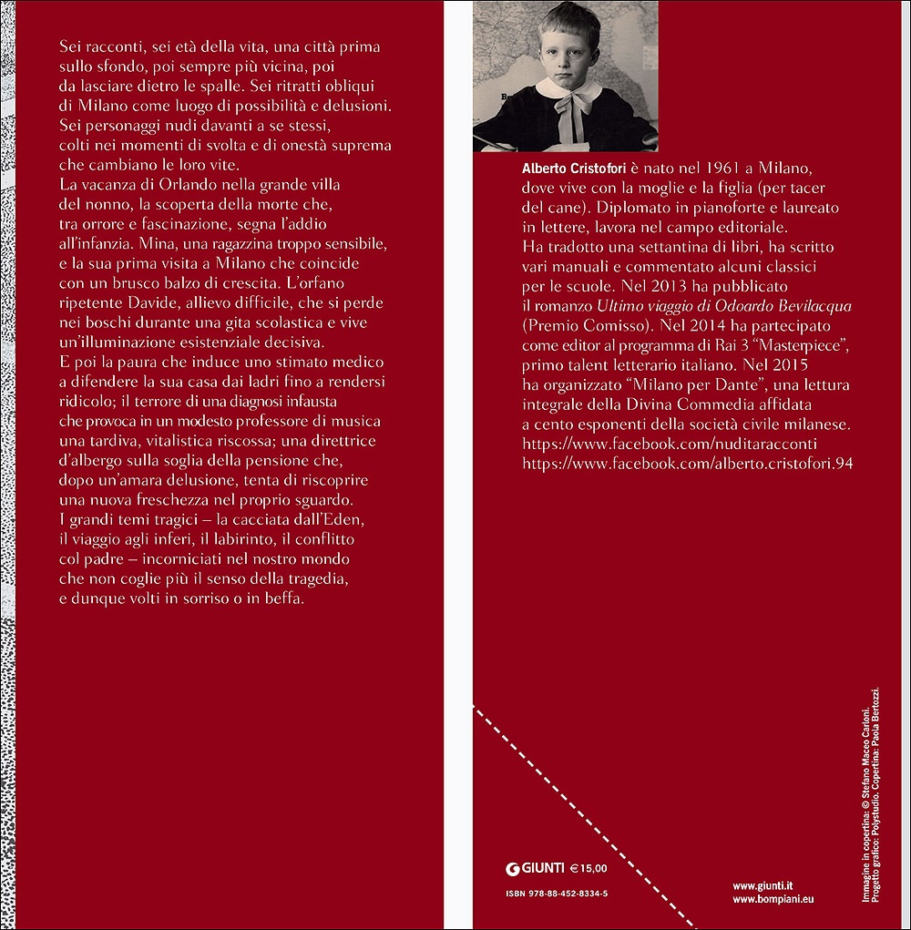 Sei racconti, sei etą della vita, una cittą prima sullo sfondo, poi sempre pił vicina, poi da lasciare dietro le spalle. Sei ritratti obliqui di Milano come luogo di possibilitą e delusioni. Sei personaggi nudi davanti a se stessi, colti nei momenti di svolta e di onestą suprema che cambiano le loro vite. La vacanza di Orlando nella grande villa del nonno, la scoperta della morte che, tra orrore e fascinazione, segna l'addio all'infanzia. Mina, una ragazzina troppo sensibile, e la sua prima visita a Milano che coincide con un brusco balzo di crescita. L'orfano ripetente Davide, allievo difficile, che si perde nei boschi durante una gita scolastica e vive un'illuminazione esistenziale decisiva. E poi la paura che induce uno stimato medico a difendere la sua casa dai ladri fino a rendersi ridicolo; il terrore di una diagnosi infausta che provoca in un modesto professore di musica una tardiva, vitalistica riscossa; una direttrice d'albergo sulla soglia della pensione che, dopo un'amara delusione, tenta di riscoprire una nuova freschezza nel proprio sguardo. I grandi temi tragici - la cacciata dall'Eden, il viaggio agli inferi, il labirinto, il conflitto col padre - incorniciati nel nostro mondo che non coglie pił il senso della tragedia, e dunque volti in sorriso o in beffa. | |