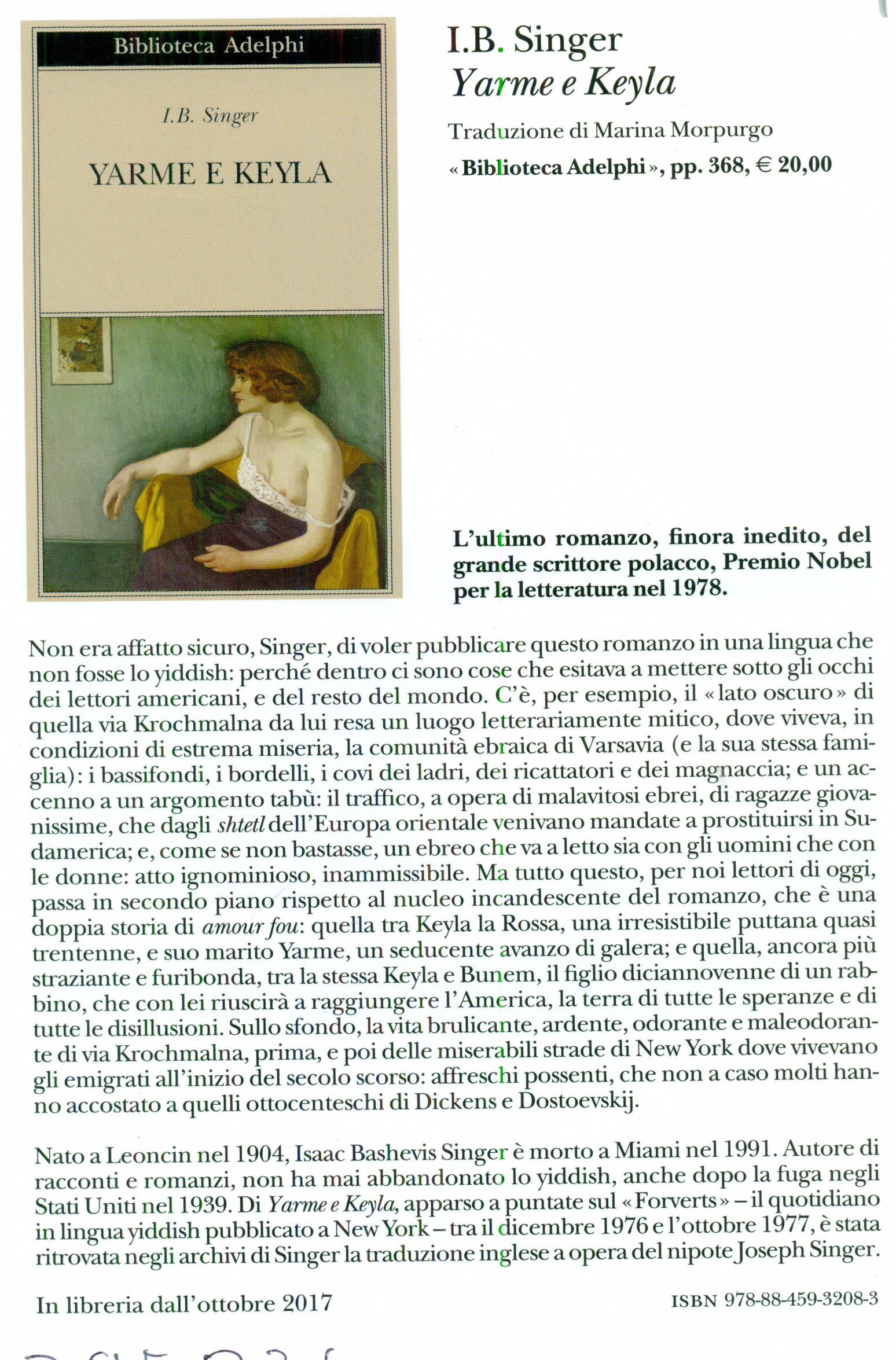 A Keyla la Rossa nessuno resiste: né Yarme – un seducente avanzo di galera –, né il giovane e fervido Bunem – che pure era destinato a d diventare rabbino come suo padre –, né l'ambiguo Max. Se questo magnifico libro è rimasto praticamente inedito fino a oggi, è forse perché Singer esitava a mettere sotto gli occhi dei lettori goy il «lato oscuro» di quella via Krochmalna da lui resa un luogo letterariamente mitico. In Keyla la Rossa si parla infatti in modo esplicito di due argomenti tabù: la tratta, a opera di malavitosi ebrei, di ragazze giovanissime, che dagli shtetl dell'Europa orientale venivano mandate a prostituirsi in Sudamerica, e l 'ignominia di un ebreo che va a letto sia con donne che con uomini. Alle turbinose vicende dei quattro protagonisti (e dei numerosi, pittoreschi comprimari) fa da sfondo, all'inizio, la vita brulicante, ardente, odorante e maleodorante del ghetto in cui era confinata, in condizioni di estrema miseria, la comunità ebraica di Varsavia, e poi quella, non meno miserabile e caotica, delle strade di New York in cui si ammassavano gli emigrati nei primi decenni del secolo scorso: affreschi possenti, che non a caso molti hanno accostato a quelli ottocenteschi di Dickens e Dostoevskij. | |