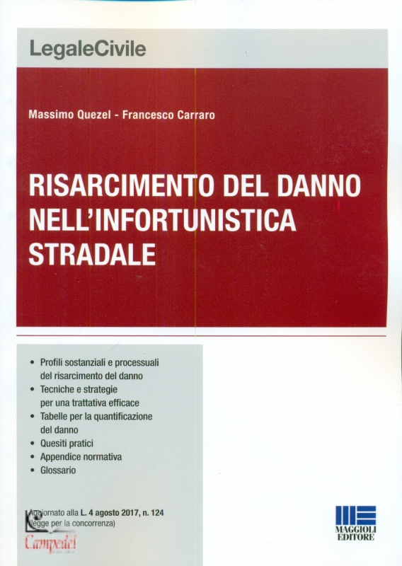 risarcimento del danno nell’infortunistica stradale Profili sostanziali e processuali del risarcimento del danno • Tecniche e strategie per una trattativa efficace • Tabelle per la quantificazione del danno • Quesiti pratici • Appendice normativa • Glossario Aggiornato alla L. 4 agosto 2017, n. 124 (legge per la concorrenza) Aggiornato con le novità introdotte dalla Legge per la Concorrenza (L. 4 agosto 2017, n. 124), questo nuovissimo Manuale operativo illustra l’ambito disciplinare e gli strumenti a disposizione del Professionista chiamato ad intervenire in materia di infortunistica stradale. L’opera è, da un lato, una guida pratica all’attività di raccolta e predisposizione della documentazione necessaria per giustificare le richieste risarcitorie alla compagnia assicurativa e, dall’altro, un utile sussidio per una corretta gestione della fase di trattativa stragiudiziale: dalla risarcibilità del danno alla quantificazione dello stesso, dalla gestione della pratica RC auto alla causa civile. Il testo fornisce al Professionista che deve relazionarsi con altre figure professionali quali medici, periti e assicuratori indicazioni utili sulle principali tecniche e strategie di comunicazione per una trattativa efficace. Completano il volume un ricco glossario dei termini tecnici più importanti, una selezione della normativa vigente e tutti i riferimenti utili delle compagnie di assicurazione operanti in Italia. | |