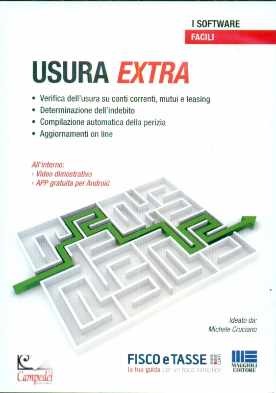 Usura extra • Verifica dell’usura su conti correnti, mutui e leasing • Determinazione dell’indebito • Compilazione automatica della perizia • Aggiornamenti on line Usura Extra permette di verificare la presenza di usura su tutti i più importanti contratti finanziari, quali: • Aperture di credito in conto corrente • Conti correnti non affidati • Conti anticipo su fatture • Mutui ipotecari a tasso fisso e variabile • Finanziamenti chirografari • Leasing immobiliare a tasso fisso e variabile • Leasing strumentale e su autoveicoli/aeronavali Il software è utilizzabile per un numero illimitato di analisi ed è in grado di gestire pressoché tutte le variabili che contribuiscono all’usura. Disponendo della documentazione bancaria, sono sufficienti pochi minuti di lavoro (inserimento dati) per ottenere risultati immediati anche per rapporti finanziari complessi, redigendo la perizia econometrica in modo del tutto automatico, secondo il seguente schema di lavoro: • inserimento dei dati contrattuali; • verifica della presenza di usura; • in caso di accertata usurarietà, determinazione dell’indebito; • compilazione automatica della perizia econometrica. La perizia viene generata in modo assolutamente automatico in formato Word (ulteriormente personalizzabile dall’utente) richiedendo, oltre ai valori numerici, solo poche altre informazioni (nome del redattore, albo di iscrizione). All’interno: › Video dimostrativo › APP gratuita per Android | |