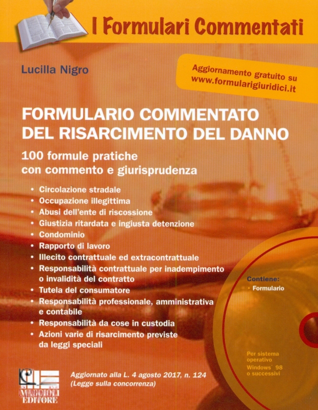 • Circolazione stradale • Occupazione illegittima • Abusi dell’ente di riscossione • Giustizia ritardata e ingiusta detenzione • Condominio • Rapporto di lavoro • Illecito contrattuale ed extracontrattuale • Responsabilità contrattuale per inadempimento o invalidità del contratto • Tutela del consumatore • Responsabilità professionale, amministrativa e contabile • Responsabilità da cose in custodia • Azioni varie di risarcimento previste da leggi speciali Aggiornato alla L. 4 agosto 2017, n. 124 (Legge sulla concorrenza), il formulario contiene 100 formule concernenti svariate tipologie di azioni di risarcimento del danno. Ogni formula è corredata da commento esplicativo e giurisprudenza di riferimento. L’opera è divisa in dodici capitoli: • risarcimento del danno in materia di infortunistica stradale; • applicazioni pratiche degli atti di citazione per il risarcimento del danno in caso di occupazione illegittima di proprietà, ad opera di enti pubblici o delle società di telefonia o erogazione dell’energia elettrica; • risarcimento del danno da fermo o iscrizione ipotecaria illegittimi o cartella esattoriale “pazza”; • azioni di risarcimento del danno per equa riparazione o ingiusta detenzione; • azioni di risarcimento del danno nella materia condominiale; • azioni di risarcimento del danno sorte in costanza del rapporto di lavoro e disciplinate dal rito del lavoro (infortunio, indennizzo, danno biologico, dimensionamento, mobbing); • risarcimento del danno non patrimoniale di cui all’articolo 2059 c.c., nelle ipotesi tipiche disciplinate da leggi speciali o riconosciute dalla giurisprudenza; • azioni di risarcimento del danno scaturenti dalla stipula di un contratto e quindi derivanti da inadempimento, nullità, vizi, evizione, falsus procurator; • risarcimento del danno in materia di tutela del consumatore; • risarcimento del danno per responsabilità professionale; • risarcimento del danno imputabile al custode ex artt. 2051 e 2053 c.c.; • azioni di risarcimento del danno previste da alcune leggi speciali. Al volume è collegato un servizio gratuito di aggiornamento on line disponibile all’indirizzo www.formularigiuridici.it; per accedere al servizio è sufficiente registrarsi con il codice stampato sul cartoncino in fondo al volume. Il Cd-Rom allegato contiene inoltre le formule in formato compilabile e stampabile. | |