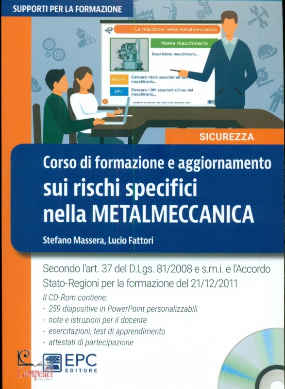 Corso di formazione e aggiornamento sui rischi specifici nella METALMECCANICA Secondo l’art. 37 del D.Lgs. 81/2008 e s.m.i. e l’Accordo Stato-Regioni per la formazione del 21/12/2011. Il CD-Rom contiene: 259 diapositive in PowerPoint personalizzabili, note e istruzioni per il docente, test di apprendimento e attestati di partecipazione Il D.Lgs 81/08 attribuisce fondamentale importanza alla formazione nella gestione dell’igiene e della sicurezza sul lavoro. L’Accordo della Conferenza Stato Regioni 222/ESR del 21/12/11 e le successive modifiche e integrazioni hanno dettagliato i percorsi formativi dedicati alla figura del lavoratore, dei dirigenti e dei preposti. Nelle disposizioni che regolano la formazione è più volte ribadito che questa deve essere “specifica”: disegnata quindi sul singolo ciclo produttivo e sulla realtà aziendale oggetto di intervento. Questo prodotto risponde all’esigenza di differenziare i percorsi didattici e contiene la traccia di un corso di formazione o aggiornamento per lavoratori del settore metalmeccanico secondo le indicazioni dell’art. 37 del D.Lgs 81/08. Il percorso proposto contiene la traccia di un modulo per rischi specifici per complessive 12 o 6 ore dedicati agli aspetti normativi ma, soprattutto, ai vari fattori di rischio riscontrabili in questi ambienti per un complesso di 259 slide commentate. Si tratta di un ulteriore testo che va ad arricchire una collana che comprende l’esame dei principali aspetti di salute e sicurezza sul lavo ro trattati con il coinvolgimento di professionisti esperti nelle specifiche materie oggetto di approfondimento. Il materiale proposto può essere facilmente adattato alle specifiche esigenze aziendali e incrementato al mutare delle condizioni e delle normative di riferimento. Al testo è allegato un CD Rom nel quale sono fornite le diapositive in formato PowerPoint oltre che le esercitazioni, i questionari di valutazione e i modelli degli attestati di formazione. | |