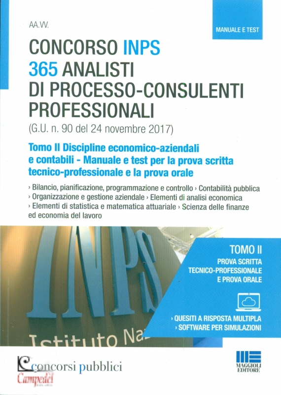 concorso inps 365 analisti di processo-consulenti professionali - discipline economico-aziendali e contabili Tomo II Discipline economico-aziendali e contabili - Manuale e test per la prova scritta tecnico-professionale e la prova orale › Bilancio, pianificazione, programmazione e controllo › Contabilità pubblica › Organizzazione e gestione aziendale › Elementi di analisi economica › Elementi di statistica e matematica attuariale › Scienza delle finanze ed economia del lavoro Il volume, teoria e quesiti insieme, è un completissimo strumento di preparazione alle discipline economico-aziendali e contabili richieste per la seconda prova scritta tecnico-professionale e la prova orale del concorso a 365 posti di analista di processo-consulente professionale nei ruoli del personale dell’INPS, area C, posizione economica C1 (G.U. n. 90 del 24 novembre 2017). Il testo costituisce il secondo tomo di un’opera in due parti per affrontare il concorso. Il tomo affronta le seguenti materie economico-aziendali e contabili previste dal bando: • bilancio, pianificazione, programmazione e controllo; • contabilità pubblica; • organizzazione e gestione aziendale; • elementi di analisi economica; • elementi di statistica e matematica attuariale (la matematica attuariale è disponibile on line); • scienza delle finanze; • economia del lavoro. Per ciascuna disciplina riportata su carta sono disponibili on line qu esiti a risposta multipla e commentata. Tali quesiti sono accessibili alla pagina www.approfondimenti.maggioli.it grazie al codice riportato in coda al volume. Con gli stessi quesiti, alla pagina indicata, è possibile allenarsi al concreto svolgimento della prova concorsuale grazie al software di simulazione. Il primo tomo affronta invece le materie giuridiche richieste dal bando, ovvero: diritto amministrativo; diritto costituzionale; diritto civile; diritto del lavoro; legislazione sociale; diritto penale. L’opera completa costituisce uno strumento di sicura utilità per prepararsi al meglio ad affrontare un concorso tanto complesso. | |