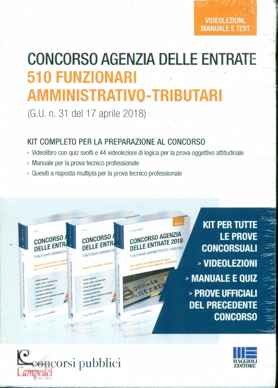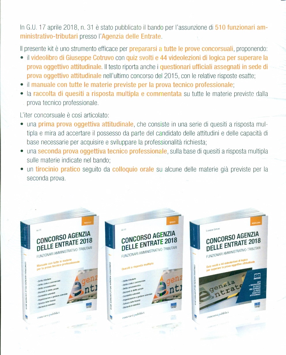 KIT COMPLETO PER LA PREPARAZIONE AL CONCORSO › Videolibro con quiz svolti e 44 videolezioni di logica per la prova oggettivo attitudinale › Manuale per la prova tecnico professionale › Quesiti a risposta multipla per la prova tecnico professionale In G.U. 17 aprile 2018, n. 31 è stato pubblicato il bando per l’assunzione di 510 funzionari amministrativo-tributari presso l’Agenzia delle Entrate. Il presente kit è uno strumento efficace per prepararsi a tutte le prove concorsuali, proponendo: • il videolibro di Giuseppe Cotruvo con quiz svolti e 44 videolezioni di logica per superare la prova oggettivo attitudinale. Il testo riporta anche i questionari ufficiali assegnati in sede di prova oggettivo attitudinale nell’ultimo concorso del 2015, con le relative risposte esatte; • il manuale con tutte le materie previste per la prova tecnico professionale; • la raccolta di quesiti a risposta multipla e commentata su tutte le materie previste dalla prova tecnico professionale. L’iter concorsuale è così articolato: • una prima prova oggettiva attitudinale, che consiste in una serie di quesiti a risposta multipla e mira ad accertare il possesso da parte del candidato delle attitudini e delle capacità di base necessarie per acquisire e sviluppare la professionalità richiesta; • una seconda prova oggettiva tecnico professionale, sulla base di quesiti a risposta multipla sulle materie indicate nel bando; • un tirocinio pratico seguito da colloquio orale su alcu ne delle materie già previste per la seconda prova. | |