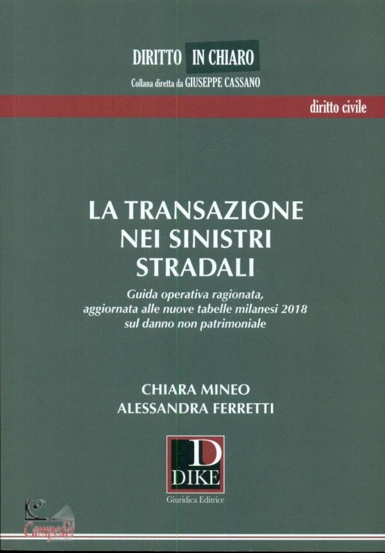La transazione nei sinistri stradali Guida operativa ragionata, aggiornata alle nuove tabelle milanesi 2018 sul danno non patrimoniale di: Chiara Mineo, Alessandra Ferretti Il volume: · approfondisce la tematica della transazione del sinistro auto, quale modalitą di liquidazione del danno derivante dalla circolazione stradale, · analizza gli aspetti legali di maggior rilievo, anche alla luce della recente riforma apportata dalla legge per la concorrenza e il mercato del 4 agosto 2017, n. 124 · ripercorre gli aspetti generali che riguardano la fase precedente alla transazione del sinistro · esamina le diverse voci di danno liquidabili, come nel caso di sinistro stradale con lesioni (con attenzione alle Tabelle del Tribunale di Milano del 2018 per la liquidazione del danno non patrimoniale) · approfondisce tutte le tematiche ripercorrendo il percorso · analizza le modalitą di liquidazione del danno alternative alla transazione | |