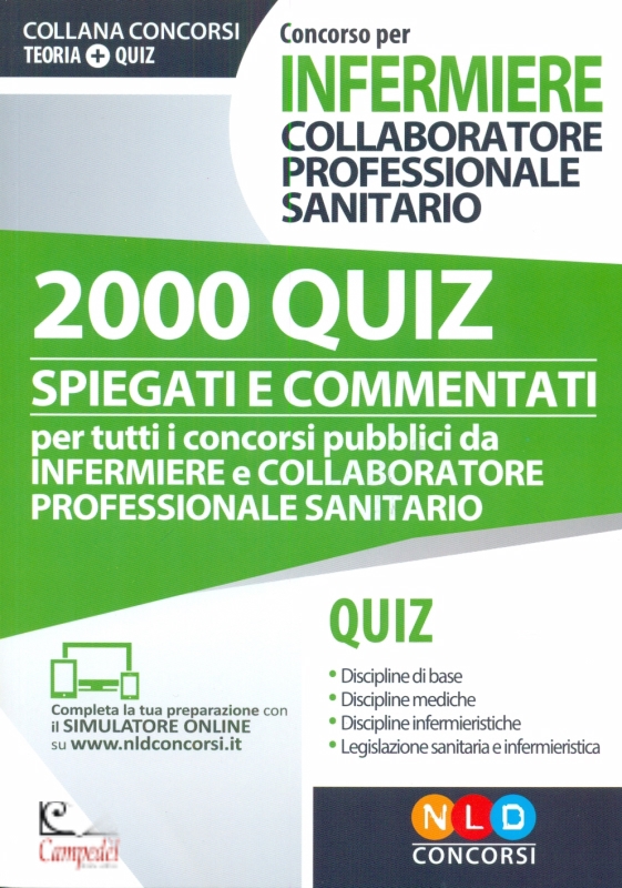 Concorso per infermiere collaboratore professionale sanitario 2000 quiz Simulatore on line Il presente testo vuole essere un valido strumento per coloro che si apprestano a sostenere la preparazione alla prova scritta e pratica di tutti i concorsi pubblici per Collaboratore professionale sanitario - Infermiere e che aspirano a conseguire una preparazione adeguata per affrontare la prova e per superarla. Pertanto il testo si prefigge l’obiettivo di rendere il candidato in grado di rispondere in maniera corretta al maggior numero possibile di domande in sede di concorso. È fondamentale, a tal scopo, prepararsi in modo efficace sulle varie attività di assistenza: preventiva, curativa, palliativa o riabilitativa. Il compito del presente testo è quello di favorire la familiarità con i test. Sono qui presentati 2.000 quiz (commentati e spiegati) a scelta multipla che puntano al ripasso degli argomenti più svariati. Il volume si basa su quesiti in grado di mettere alla prova il candidato su tecniche e procedure infermieristiche, affrontando una serie di domande dedicate alle discipline di base, quali anatomia, fisiologia, chimica, biochimica, biologia e genetica. Una particolare attenzione è stata dedicata alle discipline mediche: cardiologia, biochimica clinica, epidemiologia, chirurgia, endocrinologia, ortopedia, farmacologia, ostetricia e ginecologia, neonatologia e pediatria, igiene e psichiatria. Inoltre non mancano i quesiti sulle discipline infermieristiche (infermieristica generale e infermieristica clinica) e quesiti che riguardano la legislazione sanitaria e infermieristica. | |