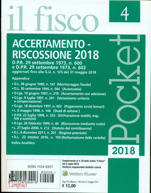 Accertamento e riscossione 2018 Il Pocket “Accertamento e Riscossione 2018” contiene il testo del D.P.R. 29 settembre 1973, n. 600 e del D.P.R. 29 settembre 1973, n. 602 aggiornati con le novitą introdotte dalla Legge di bilancio 2018 e dai decreti correttivi ed integrativi pubblicati fino a maggio 2018. In Appendice sono riportati, in estratto, i provvedimenti in materia di: - dichiarazione precompilata; - monitoraggio fiscale; - interpello dell’Amministrazione finanziaria e conto fiscale; - autotutela da parte degli uffici; - accertamento con adesione ; - studi di settore; - presentazione dichiarazioni redditi, IRAP, IVA e sostituti; - Statuto dei diritti del contribuente; - regime premiale per la trasparenza; - iscrizioni a ruolo; - versamenti unitari e compensazioni;. | |