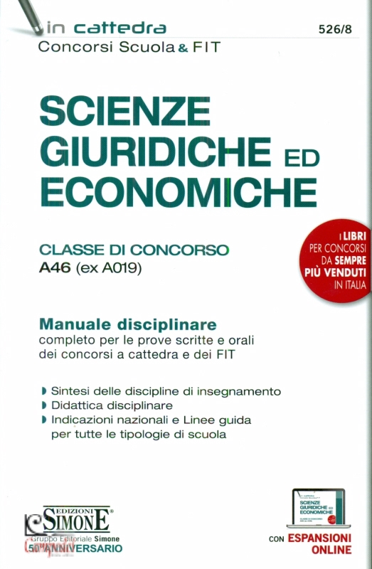 Scienze giuridiche ed economiche - Classe di concorso A46 (ex A019) Manuale disciplinare completo per le prove scritte e orali dei concorsi a cattedra e dei FIT • sintesi delle discipline di insegnamento • Didattica e disciplinare • Indicazioni nazionali e Linee guida per tutte le tipologie di scuola - con Espansioni online Questo manuale e indirizzato a quanti vogliono affrontare le prove scritte e orali dei nuovi concorsi a cattedra e dei FIT. In particolare, l’opera ripercorre per punti e snodi essenziali tutto il programma d’esame delle discipline d’insegnamento relative alla classe di concorso A46 - Scienze giuridiche ed economiche (ex A019), al fine di consentire un rapido ripasso delle materie, nonché approfondimenti sulla didattica disciplinare (per gli aspetti didattici più generali si rinvia al volume 526/B). Completano il testo le Indicazioni nazionali e le Linee guida (disponibili come Espansioni Web e accessibili tramite il QR Code posto all’interno del volume) riguardanti le discipline oggetto d’insegnamento della classe suddetta, indispensabili per una corretta progettazione di lezioni e unità d’apprendimento. Sempre in Espansioni Web saranno disponibili eventuali aggiornamenti che dovessero intervenire fino alle prove di concorso. Ricordiamo ai candidati che, oltre alle competenze disciplinari proprie di ciascuna classe di concorso, alle prove verrà testata anche la conoscenza delle cosiddette Avvertenze generali. A tale delicata sezione del programma d’esame (che comprende argomenti di didattica, psicologia dell’età evolutiva, normativa scolastica etc.) questa casa editrice dedica due volumi specifici: il 526/B - Manuale delle metodologie e tecnologie didattiche, nel quale sono approfonditi gli aspetti metodologici, divenuti ormai una parte fondamentale del processo di valutazione dell’aspirante docente; il 526/C - Legislazione e normativa scolastica, dove vengono trattate le componenti giuridiche della professione, aggiornate alle numerose novità intervenute negli ultimi anni per effetto della L. 107/2015 (cd. Buona Scuola), tra cui i D.Lgs. nn. 59, 60, 61, 62, 63, 64, 65 e 66 del 2017. | |
