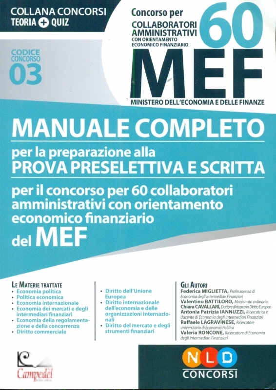 60 Collaboratori amministrativi con orientamento economico finanziario MEF Il MEF (Ministero dell’Economia e delle Finanze), in data 27 marzo 2018, ha indetto un concorso pubblico, per esami, per l’assunzione, a tempo indeterminato, di 60 unitą di personale con il profilo di collaboratore amministrativo con orientamento economico finanziario (Codice concorso 03). Lo svolgimento del concorso prevede due prove scritte ed una prova orale. Qualora il numero delle domande di partecipazione alla procedura concorsuale sia elevato (pari o superiore a sei volte il numero dei posti messi a concorso), si renderą necessario procedere ad una prova preselettiva, avente ad oggetto logica, lingua inglese ed alcune delle materie delle prove scritte. Il presente volume contiene la trattazione breve ma esaustiva di tutte le materie oggetto della prova preselettiva e della prova scritta del concorso e costituisce un valido strumento per lo studio e la preparazione dei candidati. < br> Per ciascuna materia, vengono trattate in maniera chiara e schematizzata le nozioni teoriche essenziali, in modo tale da fornire al candidato la possibilitą di apprendere rapidamente i contenuti oggetto di studio, in particolare: Economia politica Politica economica Economia internazionale Economia dei mercati e degli intermediari finanziari Economia della regolamentazione e della concorrenza Diritto commerciale Diritto dell’Unione Europea Diritto internazionale dell’economia e delle organizzazioni internazionali Diritto del mercato e degli strumenti finanziari. Si consiglia l’acquisto del presente volume in abbinamento con il “QUIZ per la preparazione alla prova preselettiva del concorso Mef”. | |