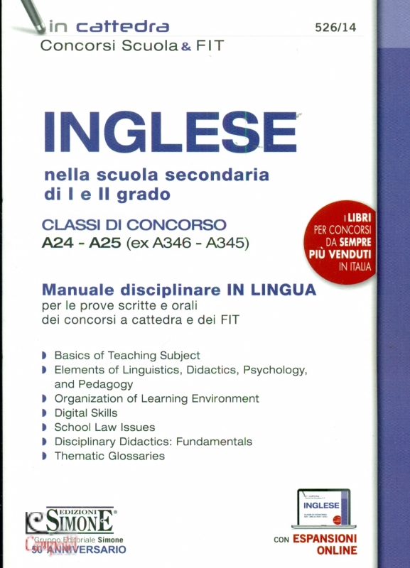 Inglese nella scuola secondaria di I e II grado - Classi di concorso A24 - A25 (ex A346 - A345) Manuale disciplinare IN LINGUA per le prove scritte e orali dei concorsi a cattedra e dei FIT • Basics of Teaching Subject • Elements of Linguistics, Didactics, Psychology and Pedagogy • Organization of Learning Environment • Digital Skills • School Law Issues • Disciplinary Didactics: Fundamentals • Thematic Glossaries - con ESPANSIONI ONLIN E Questo manuale e indirizzato a quanti vogliono affrontare le prove scritte e orali dei nuovi concorsi a cattedra e dei FIT. In particolare, l’opera (completamente in lingua) ripercorre per punti e snodi essenziali tutto il programma d’esame della disciplina d’insegnamento relativa alle classi di concorso: — A24 – Lingue e culture straniere negli istituti di istruzione secondaria di secondo grado - Inglese (ex A346); — A25 – Lingua inglese e seconda lingua comunitaria nella scuola secondaria di primo grado - Inglese (ex A345), al fine di consentire: — un rapido ripasso della materia; — nonché approfondimenti sulla didattica disciplinare (per gli aspetti didattici più generali si rinvia al volume 526/B). Completano il testo le Indicazioni nazionali e le Linee guida (disponibili come Espansioni Web e accessibili tramite il QR Code posto all’interno del volume) riguardanti la disciplina oggetto d’insegnamento delle classi suddette, indispensabili per una corretta progettazione di lezioni e unita d’apprendimento. Sempre in Espansione Web offriamo ulteriori approfondimenti su alcuni degli argomenti trattati. Ricordiamo ai candidati che, oltre alle competenze disciplinari proprie di ciascuna classe di concorso, alle prove verrà testata anche la conoscenza delle cosiddette Avvertenze generali. A tale delicata sezione del programma d’esame (che comprende argomenti di didattica, psicologia dell’età evolutiva, normativa scolastica etc.) questa casa editrice dedica due volumi specifici: * il 526/B – Manuale delle metodologie e tecnologie didattiche, nel quale sono approfonditi gli aspetti metodologici, divenuti ormai una parte fondamentale del processo di valutazione dell’aspirante docente; * il 526/C – Legislazione scolastica, dove vengono trattate le componenti giuridiche della professione, aggiornate alle numerose novità intervenute negli ultimi anni per effetto della L. 107/2015 (cd. Buona Scuola), tra cui i D.lgs. n. 59, 60, 61, 62, 63, 64, 65 e 66 del 2017. | |