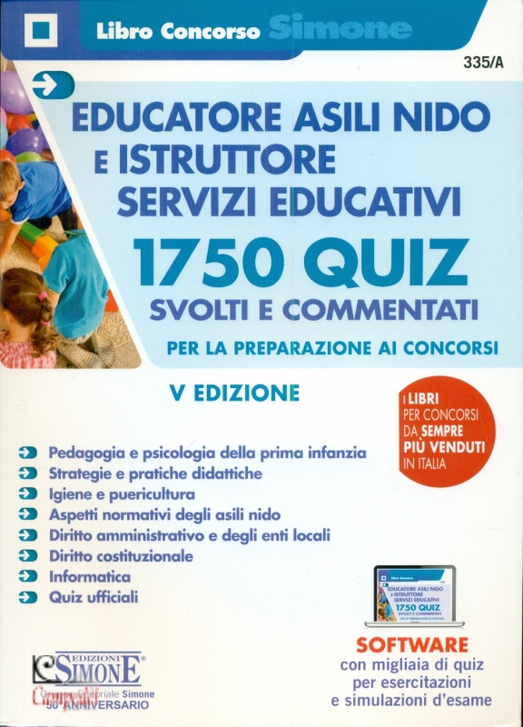 Educatore negli asili nido e Istruttore servizi educativi - 1750 Quiz svolti e commentati 1750 Quiz svolti e commentati per la preparazione ai concorsi • Pedagogia e psicologia della prima infanzia • Strategie e pratiche didattiche • Igiene e Puericultura • Aspetti normativi degli asili nido • Diritto amministrativo e degli enti locali • Diritto costituzionale • Informatica • Quiz ufficiali - SOFTWARE con migliaia di quiz per esercitazioni e simulazioni d'esame Il volume, giunto alla V edizione, interamente rivista, aggiornata e ampliata con centinaia di nuovi quiz, si propone come strumento indispensabile per la preparazione ai concorsi per educatori negli asili nido e istruttori nei servizi educativi. In base ai bandi pubblicati nei diversi Comuni italiani, per un corretto svolgimento di tali professioni vengono sempre richieste precise competenze in ambito psicologico, socio-pedagogico, didattico, igienico-sanitario, informatico, senza tralasciare la padronanza dei principali riferimenti legislativi (nazionali e regionali) attinenti alla normativa di settore. Pertanto, in piena corrispondenza con i programmi d’esame concorsuali, il volume propone 1.750 quesiti a risposta multipla, svolti e commentati, in materia di: • Pedagogia e psicologia della prima infanzia; • Strategie e pratiche didattiche; • Igiene e puericultura; • Aspetti normativi degli asili nido; • Diritto amministrativo e degli enti locali; • Diritto costituzionale; • Conoscenza e uso delle apparecchiature e applicazioni informatiche pił diffuse; • Quiz ufficiali di concorsi gią espletati. In omaggio, un software (accessibile tramite il QR-Code all’interno del volume) con migliaia di quiz ufficiali e con tutti i quesiti contenuti nel testo, per esercitarsi al meglio nella simulazione delle prove d’esame. | |
