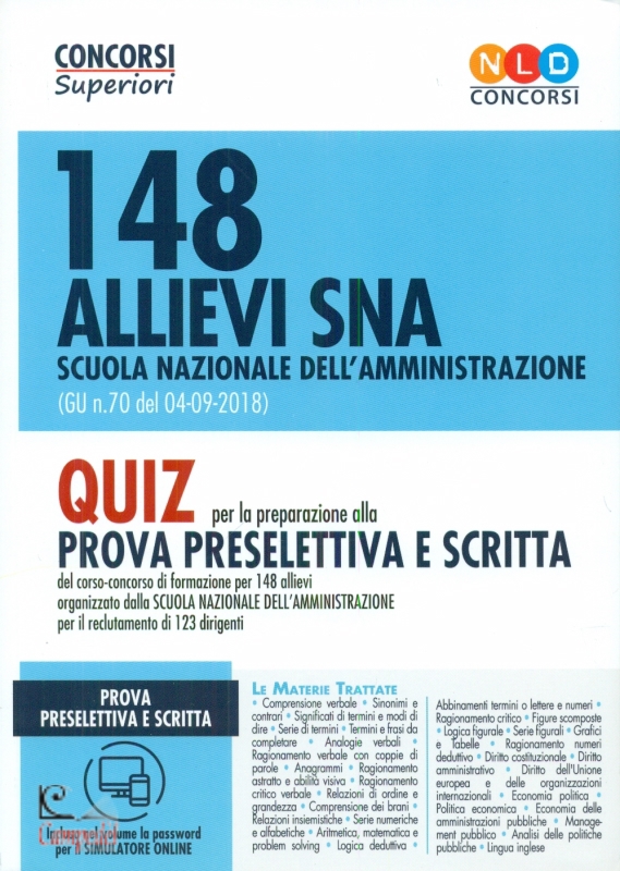 148 allievi SNA Scuola Nazionale dell'Amministrazione (G.U. n. 70 del 04-09-2018) . Quiz per la preparazione alla prova preselettiva e scritta. Con software di simulazione on line Nella Gazzetta Ufficiale 4ª Serie speciale "Concorsi ed Esami" del 4 settembre 2018 n. 70 è stato pubblicato il bando di concorso per l'ammissione di 148 allievi al corso-concorso selettivo di formazione organizzato dalla Scuola Nazionale dell'Amministrazione (SNA) per il reclutamento di 123 dirigenti. Lo svolgimento del corso-concorso prevede tre prove scritte e una orale. La prova preselettiva (laddove espletata) consisterà in un test composto da 60 quesiti a risposta multipla, di cui 24 quesiti di ragionamento logico e 36 quesiti diretti a verificare il possesso di conoscenze in specifiche materie, che saranno oggetto anche delle prove scritte. Il volume costituisce uno strumento utile per la preparazione alla prova preselettiva del corso-concorso e contiene un'ampia selezione di quiz delle seguenti tipologie: Comprensione verbale; Sinonimi e contrari; Significati di termini e modi di dire; Serie di termini; Termini e frasi da completare; Analogie verbali; Ragionamento verbale con coppie di parole; Anagrammi; Ragionamento astratto e abilità visiva; Ragionamento critico verbale; Relazioni di ordine e grandezza; Comprensione dei brani; Relazioni insiemistiche; Serie numeriche e alfabetiche; Aritmetica, matematica e problem solving; Logica deduttiva; Abbinamenti termini o lettere e numeri; Ragionamento critico; Figure scomposte; Logica figurale; Serie figurali; Grafici e tabelle; Ragionamento numeri deduttivo. Ciascuna sezione dei quiz di logica contenente le spiegazioni delle metodologie risolutive dei quesiti. Completa il volume un'ampia selezione di quiz a risposta multipla delle seguenti materie, previste dal bando di concorso: diritto costituzionale, diritto amministrativo, diritto dell'Unione europea e delle organizzazioni internazionali, economia politica, politica economica, economia delle amministrazioni pubbliche, management pubblico, analisi delle politiche pubbliche, lingua inglese. Il Manuale permette l'accesso gratuito al simulatore on line con il quale è possibile esercitarsi con batterie di domande a risposta multipla consultabile con apposita password presente nel retro del volume. | |
