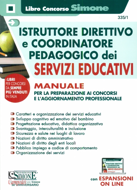 Istruttore Direttivo e Coordinatore Pedagogico Servizi Educativi Manuale per la preparazione ai concorsi e l'aggiornamento professionale Il testo offre una trattazione organica e sistematica di tutti gli argomenti necessari per la preparazione ai concorsi locali per Istruttori direttivi e Coordinatori pedagogici nei servizi educativi nonché per perfezionare le competenze professionali sempre più elevate di queste figure, che riflettono l’accresciuta importanza del ruolo dei servizi per l’infanzia. Da ultimo, la cd. Riforma 0-6 anni, approvata con il D.Lgs. 65/2017, di attuazione della L. 107/2015 (cd. Buona Scuola) ha previsto un sistema integrato di educazione e istruzione dalla nascita fino ai 6 anni al fine di sviluppare potenzialità di relazione, autonomia, creatività e apprendimento in un adeguato contesto affettivo, ludico e cognitivo. Al fine di facilitare lo studio e costruire una proficua preparazione, in linea con i programmi presenti nei più recenti bandi di concorso comun ali, il volume è strutturato in parti che raggruppano gli argomenti richiesti nelle diverse selezioni concorsuali che sono: — Legislazione sui servizi educativi — Elementi di psicologia — Elementi di pedagogia — Progettazione educativa — Integrazione e inclusione — Salute e sicurezza — Nozioni di diritto amministrativo — Nozioni di diritto degli enti territoriali e pubblico impiego — Organizzazione dei servizi e gestione del personale Il manuale è arricchito anche da una serie di espansioni online di approfondimento, accessibili tramite il Qr Code che trovi all’interno del volume. | |