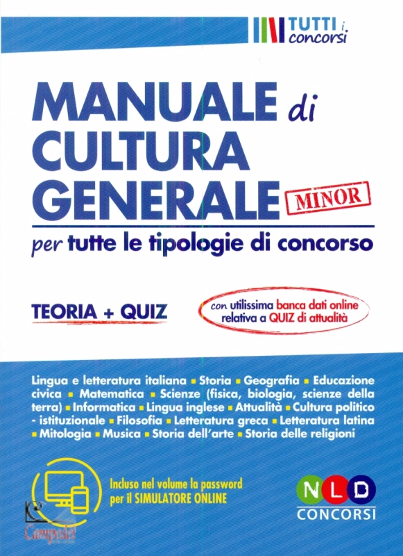 Manuale di cultura generale. Per tutte le tipologie di concorso. Edizione minor Pubblicato da Nel Diritto Il manuale di cultura generale costituisce un indispensabile strumento per la preparazione alla prova di Cultura generale per tutte le tipologie di concorso, con una analisi dettagliata dei principali argomenti delle diverse materie, a cui si aggiungono specifici riferimenti ai maggiori eventi di attualità, aggiornati fino ad oggi (disponibili nella estensione on line del testo, consultabile con apposita password presente nel retro del volume). Di ciascuna materia, vengono trattate in maniera chiara ed esaustiva le nozioni teoriche essenziali, in modo tale da fornire al candidato la possibilità apprendere rapidamente i concetti e di ripassare velocemente i contenuti oggetto di studio. Le materie oggetto di trattazione sono: - lingua e letteratura italiana - storia - geografia - educazione civica - matematica - scienze (fisica, biologia, scienze della terra) - informatica - lingua inglese - attualità - cultura politico istituzionale - filosofia - letteratura greca - letteratura latina - mitologia - musica - storia dell’arte - storia delle religioni Completa il volume una utilissima estensione online, con la quale è possibile esercitarsi con batterie di domande a risposta multipla, aventi ad oggetto ciascuna delle materie oggetto del volume. | |
