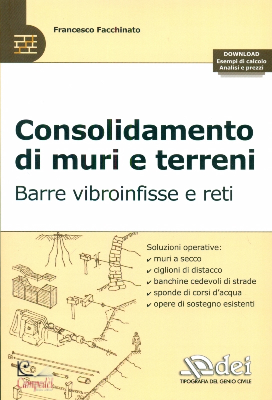 Facchinato Francesco Consolidamento di muri e terreni – Barre vibroinfisse e reti Soluzioni operative: muri a stacco ciglioni di distacco banchine cedevoli di strade sponde di corsi d’acqua opere di sostegno esistenti Il testo propone una tecnica semplice, economica e di basso impatto, già sperimentata e verificata in interventi di consolidamento di centinaia di tratti di muri di sostegno, prevalentemente a secco, consistente nella vibroinfis sione, con moto e elettrodemolitore, nel terreno a tergo di muri problematici, di barre in acciaio che vi si ancorano per attrito producendo le forze che garantiranno la stabilità del muro arrestando aggetti e spanciamenti. Le stesse barre, in combinazione con reti in poliestere a maglia fitta e metalliche, consentono di risolvere in modo altrettanto semplice, economico e ad impatto nullo, molte situazioni in cui l’instabilità è dovuta ai terreni. Le barre vibroinfisse, infatti, grazie all’attrito gene rato in profondità, sono in grado di contenere le reti metalliche, che a loro volta includono quelle a maglia fitta, garantendo la stabilità dei terreni nei casi in cui la pendenza è superiore a quella di natural declivio, i sovraccarichi sono elevati o l’acqua impetuosa e abbondante nei corsi d’acqua tende a disgregare le sponde. All’interno del testo, corredato di alcuni esempi di calcolo per le verifiche di consolidamenti di muri, terreni e pendii, sono riportate soluzioni anche per altre situazioni problematiche e alcune proposte operative nelle quali dispositivi, macchine e materiali, già diffusi sul mercato per altri usi, sono utilizzati con piccoli adattamenti per renderli più efficaci e adeguarli alle nuove funzioni. In omaggio con l’acquisto del volume esempi di calcolo per le verifiche di consolidamenti di muri, terreni e pendii, analisi e prezzi, foto e filmati | |