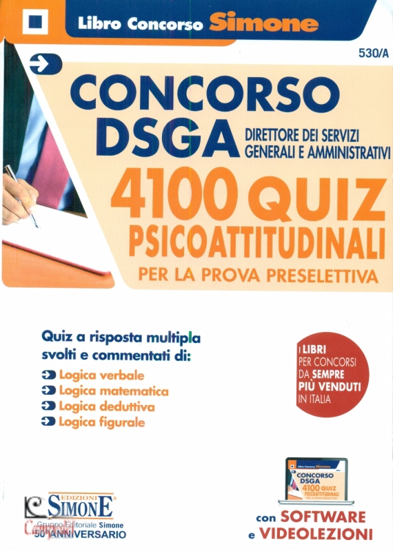 Concorso DSGA Direttore dei servizi Generali e Amministrativi - 4100 Quiz Psicoattitudinali per la prova preselettiva Pubblicato da Simone Quiz a risposta multipla svolti e commentati di: • Logica verbale • Logica matematica • Logica deduttiva • Logica figurale - con SOFTWARE e VIDEOLEZIONI Il concorso per DSGA – Direttore dei servizi generali e amministrativi è atteso da molto tempo. In base alla bozza di regolamento diffusa dal MIUR a d ottobre 2018 il concorso si articolerà in due prove scritte di cui una a carattere teorico-pratico e una prova orale su varie materie giuridiche e attinenti alla professione, precedute da una prova preselettiva volta all’accertamento delle capacità psico-attitudinali. Questo volume, utile per iniziare a prepararsi alla prova preselettiva, presenta una raccolta di 4100 quiz di logica psicoattitudinale, tutti commentati, e di varia tipologia: dai quiz di grammatica ai sinonimi e contrari, dal le analogie figurali ai sillogismi, dai quesiti aritmetici al problem solving, dalle deduzioni semplici alle serie numeriche ecc. Alcuni di questi quiz sono inediti, altri sono stati presi da banche dati ufficiali utilizzate nei più recenti concorsi, ciò per fornire una panoramica quanto più ampia possibile dei vari quiz a scelta multipla che potrebbero essere somministrati in sede di concorso. Il numero delle risposte alternative varia da 3 a 5 per permettere un approfondimento progressivo d el grado di difficoltà dei quiz: i quesiti a tre risposte sono, infatti, generalmente più facili rispetto a quelli a 5 risposte dove ci sono più distrattori. Ogni quesito è corredato di risposta commentata, in modo da guidare il lettore nella risoluzione. Inoltre per tipologie di quiz simili, sono state proposte chiavi di risoluzione diverse, in modo da permettere di scegliere quella per ciascuno più «intuitiva» e congeniale. Ogni tipologia di quiz è poi preceduta da una scheda teorica che introduce i criteri logici che sono alla base di una certa categoria di quiz, fornendo le chiavi di risoluzione generali. Completano il volume, e scaricabili con il QRcode all’interno del volume, un potentissimo software per la simulazione con tutti i quesiti contenuti nel testo e 3 videolezioni di logica, utilissime per completare la preparazione. | |