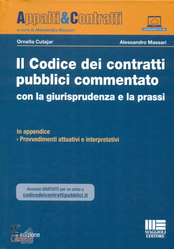 Il codice dei contratti pubblici commentato con la giurisprudenza e la prassi Autori Ornella Cutajar - Alessandro Massari Editore Maggioli Editore Il Codice dei contratti pubblici commentato con la giurisprudenza e la prassi, alla sua seconda edizione dopo il successo della precedente, è concepito come importante strumento di agevole consultazione per gli operatori che intendono individuare, per ciascuna disposizione del Codice, la preziosa, ricca ed articolata interpretazione fornita dalla giurisprudenza amministrativa ed europea, così come dall’ANAC e dai Ministeri. Per la corretta applicazione delle norme del D.Lgs. 50/2016, caratterizzate da una peculiare vocazione giurisprudenziale, diventa infatti imprescindibile interpretare il complesso impianto normativo del Codice attraverso l’accurato esame del “diritto vivente”. In questa seconda edizione si è provveduto ad un consistente lavoro di aggiornamento delle sentenze, della dottrina e dei provvedimenti dell’ANAC , focalizzando l’attenzione sugli atti e sulle pronunce emanate proprio in applicazione del nuovo Codice e del decreto correttivo D.Lgs. 56/2017. Completano l’opera una pregevole bibliografia, sud- divisa per specifici argomenti, e un utilissimo indice analitico ragionato. Inoltre, il lettore, tramite un codice alfanumerico riservato allegato al volume, potrà accedere gratuitamente per un anno al codicedeicontrattipubblici.it | |