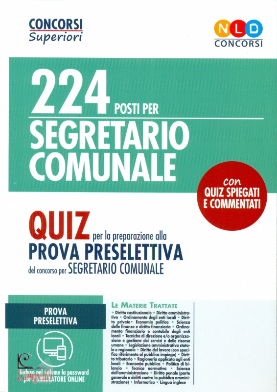 224 posti per segretario comunale. Quiz per la preparazione alla prova preselettiva del concorso per segretario comunale Pubblicato da:Neldiritto editore Collana: Concorsi superiori Il 28 dicembre 2018 il Ministero dell’Interno dipartimento per gli Affari Interni e Territoriali ha indetto un concorso pubblico, per esami, per l’ammissione di 291 borsisti al 6° corso di formazione per il conseguimento dell’abilitazione richiesta ai fini dell’iscrizione di 224 segretari comunali nella fascia iniziale dell’Albo Nazionale dei segretari comunali e provinciali. La prova preselettiva consiste nella soluzione in un tempo predeterminato di 70 quesiti a risposta multipla, da risolvere nel tempo massimo di 45 minuti, attinenti alle materie oggetto delle prove scritte ed orali del concorso, ivi compresa la conoscenza dell'uso delle apparecchiature e delle applicazioni informatiche più diffuse e della lingua inglese, nonché al ragionamento logico, deduttivo e numerico. Il volume dei quiz si pone come principale strumento da utilizzare per lo studio e la preparazione del concorso, infatti, deve essere inteso come strumento indispensabile per la preparazione alla prova preselettiva. Il testo è suddiviso in due parti: una prima parte composta dai quiz commentati ed una seconda parte composta dai quiz non commentati. Mediante i quiz commentati il candidato può, mediante la ricostruzione esplicata dello stesso, comprendere le nozioni alla base del singolo quiz. Invece, mediante i quiz non commentati, il candidato può mettersi alla prova memorizzando i singoli concetti in maniera pratica. Il volume consente di testare diffusamente le proprie conoscenze e la propria preparazione su tutte le materie oggetto del bando, consentendo la possibilità, mediante l’accesso al simulatore online, di esercitarsi su vere e proprie simulazioni a tempo, gareggiando con gli altri utenti e verificando costantemente i propri progressi nella classifica virtuale. | |