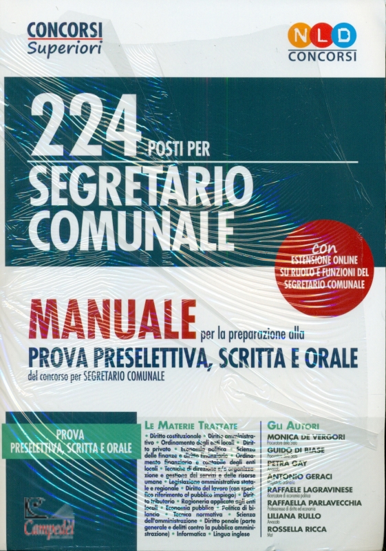 Kit 224 posti per segretario comunale: Manuale per la preparazione alla prova preselettiva, scritta e orale. Quiz per la preparazione alla prova preselettiva Editore: Nld Concorsi Collana: Concorsi superiori Il kit è composto da due volumi: - Manuale per la preparazione alla prova preselettiva, scritta e orale. Con espansione online - Quiz per la preparazione alla prova preselettiva del concorso per segretario comunale MANUALE Il 28 dicembre 2018 il Ministero dell’Interno dipartimento per gli Affari Interni e Territoriali ha indetto un concorso pubblico, per esami, per l’ammissione di 291 borsisti al 6° corso di formazione per il conseguimento dell’abilitazione richiesta ai fini dell’iscrizione di 224 segretari comunali nella fascia iniziale dell’Albo Nazionale dei segretari comunali e provinciali. Il concorso sarà come di seguito articolato: - Una prova preselettiva, consistente nella somministrazione di 70 quesiti sulle materie oggetto del bando ; - Una prima prova scritta avente ad oggetto argomenti di carattere giuridico; - Una seconda prova scritta avente ad oggetto argomenti di carattere economico e finanziario; - Una terza prova scritta avente ad oggetto le tecniche di direzione e/o organizzazione e gestione delle risorse umane; - Una prova orale volta ad accertare sia le materie oggetto delle prove scritte sia materie inerenti la disciplina degli enti locali, della lingua inglese e delle apparecchiature e delle applicazioni informatiche. Il presente volume contiene una trattazione esaustiva di tutte le materie oggetto del bando, soffermandosi sulle nozioni teoriche essenziali in maniera approfondita, garantendo al candidato la possibilità di apprendere rapidamente i contenuti oggetto di studio. Il testo nasce con l’obiettivo di fornire agli aspiranti segretari comunali le nozioni indispensabili per far fonte alle competenze proprie della qualifica che si sostanziano nello svolgimenti di funzioni di collaborazione e di assistenza giuridica e amministrativa in favore dell'ente presso cui viene prestata la propria attività lavorativa. A tal fine il volume è stato suddiviso per materie, ripartite, a loro volta, in parti consentendo così al candidato di rintracciare gli argomenti all’interno dello stesso e memorizzare i singoli concetti in maniera più agevole. Rispecchiando le indicazioni del bando, per ciascuna materia, vengono trattate in maniera chiara e schematizzata le nozioni teoriche essenziali, in modo tale da fornire al candidato la possibilità di apprendere rapidamente i contenuti oggetto di studio, in particolare: -diritto costituzionale -diritto amministrativo -ordinamento degli enti locali -diritto privato -economia politica -scienza delle finanze e diritto finanziario -ordinamento finanziario e contabile degli enti locali -tecniche di direzione e/o organizzazione e gestione dei servizi e delle risorse umane -legislazione amministrativa statale e regionale, -diritto del lavoro (con specifico riferimento al pubblico impiego), -diritto tributario, -ragioneria applicata agli enti locali, -economia pubblica, -politica di bilancio, -tecnica normativa, -scienza dell'amministrazione, -diritto penale (parte generale e delitti contro la pubblica amministrazione) -informatica -lingua inglese Il testo, aggiornato alle più recenti novità legislative, permette di accedere all’apposita sezione online dedicata al volume all’interno della quale verranno caricate costantemente delle estensioni online esplicative del ruolo e delle funzioni proprie del segretario comunale. Si consiglia l’acquisto del presente volume in abbinamento con il “QUIZ per la preparazione alla prova preselettiva del corso-concorso selettivo di formazione per il conseguimento dell'abilitazione richiesta ai fini dell'iscrizione di duecentoventiquattro segretari comunali nella fascia iniziale dell'Albo Nazionale dei segretari comunali e provinciali”. QUIZ Il 28 dicembre 2018 il Ministero dell’Interno dipartimento per gli Affari Interni e Territoriali ha indetto un concorso pubblico, per esami, per l’ammissione di 291 borsisti al 6° corso di formazione per il conseguimento dell’abilitazione richiesta ai fini dell’iscrizione di 224 segretari comunali nella fascia iniziale dell’Albo Nazionale dei segretari comunali e provinciali. La prova preselettiva consiste nella soluzione in un tempo predeterminato di 70 quesiti a risposta multipla, da risolvere nel tempo massimo di 45 minuti, attinenti alle materie oggetto delle prove scritte ed orali del concorso, ivi compresa la conoscenza dell'uso delle apparecchiature e delle applicazioni informatiche più diffuse e della lingua inglese, nonché al ragionamento logico, deduttivo e numerico. Il volume dei quiz si pone come principale strumento da utilizzare per lo studio e la preparazione del concorso, infatti, deve essere inteso come strumento indispensabile per la preparazione alla prova preselettiva. Il testo è suddiviso in due parti: una prima parte composta dai quiz commentati ed una seconda parte composta dai quiz non commentati. Mediante i quiz commentati il candidato può, mediante la ricostruzione esplicata dello stesso, comprendere le nozioni alla base del singolo quiz. Invece, mediante i quiz non commentati, il candidato può mettersi alla prova memorizzando i singoli concetti in maniera pratica. Difatti, il volume consente di testare diffusamente le proprie conoscenze e la propria preparazione su tutte le materie oggetto del bando, consentendo la possibilità, mediante l’accesso al simulatore online, di esercitarsi su vere e proprie simulazioni a tempo, gareggiando con gli altri utenti e verificando costantemente i propri progressi nella classifica virtuale. | |