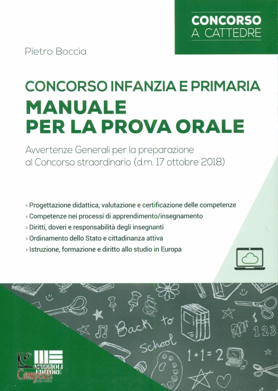 Concorso infanzia e primaria. Manuale per la prova orale. Autori Pietro Boccia Editore Maggioli Editore Collana: Concorsi a cattedre Avvertenze Generali per la preparazione al Concorso straordinario (d.m. 17 ottobre 2018) › Progettazione didattica, valutazione e certificazione delle competenze › Competenze nei processi di apprendimento/insegnamento › Diritti, doveri e responsabilitą degli insegnanti › Ordinamento dello Stato e cittadinanza attiva › Istruzione, formazione e diritto allo studio in Europa Il Manuale costituisce uno strumento indispensabile per la preparazione alla prova orale del Concorso straordinario per la scuola dell’infanzia e primaria (d.m. 17 ottobre 2018). La prova orale, della durata massima di 30 minuti, consiste nella progettazione di un’attivitą didattica, comprensiva dell’illustrazione delle scelte contenutistiche, didattiche, metodologiche e di esempi di utilizzo pratico delle tecnologie dell’informazione e della comunicazione. Il testo, seguendo le disposizioni contenute nell’Allegato A del d.m. 17 ottobre 2018 per quanto concerne i requisiti culturali e professionali correlati ai posti di insegnamento nella scuola dell’infanzia e primaria, offre una trattazione manualistica che ne sintetizza i principali punti: › Ordinamento dello Stato, cittadinanza attiva (Costituzione, Enti locali, organizzazioni complesse, pubblica amministrazione); › Scuola dell’infanzia e primaria nella storia del sistema scolastico (scuola dell’infanzia, storia della scuola primaria, progettazione didattica, valutazione e certificazione delle competenze, scuola dell’autonomia e Piano dell’offerta formativa, legge n. 107/2015 e d.lgs. n. 65/2017); › Istruzione, formazione e diritto allo studio in Europa (sistemi dell’istruzione e della formazione dell’Ue); › Diritti, doveri e responsabilitą degli insegnanti (stato giuridico, contratto di lavoro, diritti e doveri, ricerca e sperimentazione); › Competenze nei processi di apprendimento/insegnamento dell’insegnante (competenze sociali e culturali, competenze psicologiche nella scuola dell’infanzia e primaria, competenze metodologiche e stili di apprendimento/ insegnamento, competenze pedagogico / didattiche, competenze nella didattica speciale, competenze linguistiche e digitali/informatiche). Nella sezione online su https://www.maggiolieditore.it/approfondimenti, accessibile tramite il codice riportato in fondo al volume, sono disponibili esempi di prova orale in lingua straniera. INDICE › Ordinamento dello Stato e cittadinanza attiva - Costituzione italiana e ordinamento dello Stato - Competenze delle Autonomie locali e riforma della Costituzione - Comunicazione istituzionale nelle organizzazioni complesse - Pubblica amministrazione e art. 97 della Costituzione - Globalizzazione e pedagogia interculturale - Competenze della scuola autonoma e organi collegiali - Competenze e funzioni delle Regioni, delle cittą metropolitane e degli Enti locali › Scuola dell’infanzia e primaria nella storia del sistema scolastico - Nascita e cenni storici della scuola italiana - Scuola dell’infanzia - Storia della scuola primaria - Progettazione didattica, valutazione e certificazione delle competenze - Scuola dell’autonomia e Piano dell’offerta formativa - L. n. 107/2015 e d.lgs. n. 65/2017 › Istruzione, formazione e diritto allo studio in Europa - Unione europea - Diritto allo studio, istruzione e formazione in Europa › Diritti, doveri e responsabilitą degli insegnanti - Nuovo diritto di lavoro per i dipendenti nella pubblica amministrazione - Stato giuridico degli insegnanti - Ricerca e sperimentazione › Competenze nei processi di apprendimento-insegnamento - Competenze e strategie comunicative nel rapporto educativo - Competenze psicologiche nella scuola dell’infanzia e primaria - Competenze metodologiche e stili di apprendimento/in segnamento - Competenze pedagogico/didattiche - Competenze nella didattica speciale - Competenze nell’area delle lingue straniere - Competenze digitali/informatiche | |