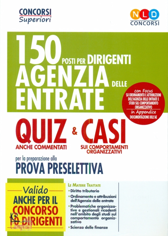 150 posti per dirigenti Agenzia delle Entrate. Quiz anche commentati e casi sui comportamenti organizzativi per la preparazione alla prova preselettiva. Con Contenuto digitale per accesso on line Pubblicato da: Nel diritto Collana: Concorsi superiori Valido anche pei il concorso 10 dirigenti Il presente volume costituisce un valido ed utile strumento per la preparazione alla prova preselettiva e contiene un'ampia selezione di quesiti a risposta multipla delle materie oggetto dei ba ndi di concorso. I quiz di diritto tributario, scienza delle finanze, nonché ordinamento e attribuzioni dell'Agenzia delle entrate sono divisi in due parti: quiz commentati e non commentati. Mediante i quiz commentati, il candidato può, consultando la ricostruzione esplicata del singolo quesito, ripassare le nozioni alla base del singolo quiz. Invece, mediante i quiz non commentati, il candidato può mettersi alla prova, memorizzando i singoli concetti in maniera pratica. Una terza parte è dedicata ai casi, relativi a problematiche organizzative e gestionali ricadenti nell'ambito degli studi sul comportamento organizzativo. I casi, impostati secondo l'innovativa struttura indicata nei due bandi di concorso, descrivono situazioni concrete di lavoro, rispetto alle quali s'intende valutare la capacità di giudizio dei candidati, chiedendo loro di decidere, tra almeno quattro alternative predefinite di possibili soluzioni operative, quale ritengano più adeguata e quale, invece, meno adeguata . Arricchiscono il volume le trattazioni (brevi ma esaustive) delle nozioni teoriche essenziali su ordinamento e attribuzioni dell'Agenzia delle entrate e problematiche organizzative e gestionali ricadenti nell'ambito degli studi sul comportamento organizzativo. Utile l'appendice relativa alla documentazione ufficiale dell'AE in materia di ordinamento ed attribuzioni dell'Agenzia. Il volume permette l'accesso gratuito al simulatore on line, con il quale è possibile esercitarsi con le batterie di domande a risposta multipla, consultabile con apposita password presente nel retro del volume. | |
