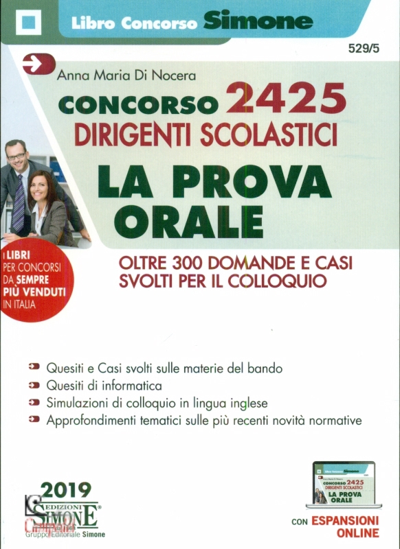 Concorso 2425 Dirigenti Scolastici - La Prova Orale Oltre 300 domande e casi svolti per il colloquio • Quesiti e Casi svolti sulle materie del bando • Quesiti di informatica • Simulazioni di colloquio in lingua inglese • Approfondimenti tematici sulle più recenti novità normative - con Espansioni online A cura di Anna Maria Di Nocera Pubblicato da: Simone Collana Il libro concorso Questo volume costituisce un indispensabile strumento di preparazione mirato al superamento della prova orale del concorso per Dirigenti scolastici, bandito con G.U. 24 novembre 2017, n. 90. Aderendo al programma previsto dal bando, questo manuale presenta, nella Parte prima, oltre 300 domande e casi pratici svolti concernenti tutte le materie oggetto della prova: le relative soluzioni sono elaborate in maniera sintetica ma completa, al fine di far acquisire il metodo più efficace per impostare una risposta che sia sufficientemente esaustiva e approfondita, ma compatibile con i ridotti tempi della prova orale. Domande e casi altresì tengono conto delle ultime novità normative (come la legge di bilancio 2019, il D.M. 37/2019 sugli esami di Stato, il D.I. 129/2018, nuovo Regolamento di contabilità ecc.) e riportano approfondimenti e collegamenti con la realtà della scuola e la funzione svolta dal DS. Le domande e i casi concernono quesiti su aspetti giuridici, gestionali, organizzativi e amministrativi, utilizzando la metodologia del problem solving, e pongono questioni che sollecitano ipotesi operative e di leadership esercitata. Nella Parte seconda del volume sono presenti esempi di domande relative agli strumenti informatici e alle Tecnologie dell’informazione e della comunicazione (TIC), ispirati a vere domande oggetto di prova orale in altri concorsi nella scuola. La Parte terza è dedicata, invece, alla lingua inglese e propone elementi per affrontare il colloquio in lingua con suggerimenti nonché esempi di conversazione e di fraseologia tra i più ricorrenti, nonché esempi di brani tradotti, nell’intento di simulare il colloquio in lingua della prova orale. Alcune schede grammaticali di ripasso nonché gli audiopractice per esercitarsi sulla pronuncia sono disponibili in espansione online. Completano il lavoro alcuni Focus di approfondimento sui principali aggiornamenti normativi che hanno interessato il settore scolastico nell’ultimo anno. | |