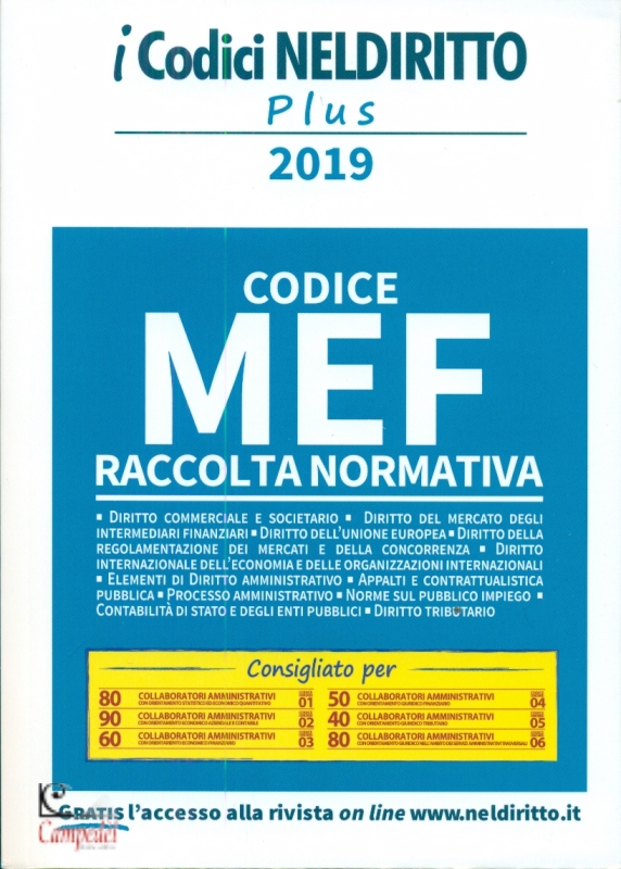 Codice MEF. Raccolta normativa 2019 Pubblicato da: Nel diritto Collana: I codici Neldiritto plus 2019 Il MEF (Ministero dell’Economia e delle Finanze), in data 27 marzo 2018 ha in detto tre concorsi (Classe di concorso 01, 02, 03) ed in data 6 aprile 2018 ha indetto altri tre concorsi pubblici (Classi di concorso 04, 05, 06) per la copertura di complessivi 400 posti per l'accesso a vari profili professionali di collaboratore amministrativo. Lo svolgimento del concorso prevede due prove scritte ed una prova orale. Le due prove scritte sono volte ad accertare la preparazione del candidato sia sotto il profilo teorico sia sotto quello applicativo-operativo e si svolgeranno in due diverse giornate. La prima prova scritta consiste nella redazione di uno o più elaborati ed ha il fine di verificare l'attitudine del candidato all'analisi e alla riflessione critica con riferimento alle materie indicate nei bandi di concorso. La seconda prova scritta ha contenuto teorico-pratico ed ha il fine di verificare l'attitudine del candidato all'analisi e alla soluzione di problematiche rientranti nella sfera di attività dello specifico profilo per il quale si concorre, nonché la conoscenza della lingua inglese. Tali prove avranno ad oggetto, tra le altre, le seguenti materie: -DIRITTO COMMERCIALE E SOCIETARIO - DIRITTO DEL MERCATO DEGLI INTERMEDIARI FINANZIARI - DIRITTO DELL’UNIONE EUROPEA - DIRITTO DELLA REGOLAMENTAZIONE DEI MERCATI E DELLA CONCORRENZA - DIR ITTO INTERNAZIONALE DELL’ECONOMIA E DELLE ORGANIZZAZIONI INTERNAZIONALI - ELEMENTI DI DIRITTO AMMINISTRATIVO - APPALTI E CONTRATTUALISTICA PUBBLICA - PROCESSO AMMINISTRATIVO - NORME SUL PUBBLICO IMPIEGO - CONTABILITÀ DI STATO E DEGLI ENTI PUBBLICI - DIRITTO TRIBUTARIO Ai partecipanti al concorso è consentito l’utilizzo di un codice, solo normativo, contenente una selezione della normativa più importante relativa alle materie oggetto delle prove concorsuali. Questo codice ha l’ambizione di essere strumento unico, completo ed essenziale per sostenere le prove scritte del concorso Mef. | |