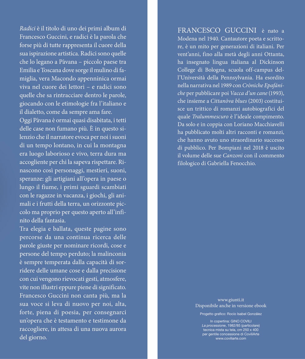 "Radici" è il titolo di uno dei primi album di Francesco Guccini, e radici è la parola che forse più di tutte rappresenta il cuore della sua ispirazione artistica. Radici sono quelle che lo legano a Pàvana – piccolo paese tra Emilia e Toscana dove sorge il mulino di famiglia, vera Macondo appenninica ormai viva nel cuore dei lettori – e radici sono quelle che sa rintracciare dentro le parole, giocando con le etimologie fra l’italiano e il dialetto, come da sempre ama fare.