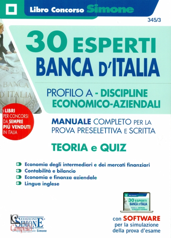 30 Esperti Banca d'Italia - Profilo A - Discipline Economico-aziendali - Manuale completo per la prova preselettiva e scritta - Teoria e quiz Pubblicato da Simone Collana: Il libro concorso Manuale completo per la prova preselettiva e scritta - Teoria e quiz • Economia degli intermediari e dei mercati finanziari • Contabilità e bilancio • Economia e finanza aziendale • Lingua inglese - con SOFTWARE per la simulazione della prova d'esame Anno Edizione: 2019 Il 27 agosto 2 019 la Banca d’Italia ha pubblicato il bando di concorso per 55 Esperti, tra cui 30 Esperti con orientamento nelle discipline Economico-Aziendali (profilo A). Per ciascuno dei profili è prevista una preselezione mediante test sulle materie della prova scritta e sulle competenze in lingua inglese, una prova scritta consistente nello svolgimento di quattro quesiti a risposta sintetica e di una prova in lingua inglese, oltre che una successiva prova orale. Questo volume, pensato per la preparazione al profilo A, costituisce uno strumento di studio indispensabile in vista della prova preselettiva e della prova scritta: approfondisce, infatti, tutti gli argomenti del programma d’esame previsto dal bando, che affronta argomenti molto specifici e altamente professionalizzanti. A tal fine il testo, aggiornato alle più recenti novità normative, comprende una parte manualistica che sviluppa le seguenti materie: — Economia degli intermediari finanziari; — Contabilità e bilancio; — Economia e finanza aziendale; e una ricca sezione con centinaia di quiz a risposta multipla comprensivi di tutte le materie e di quelli in lingua inglese, utili sia per la preparazione alla prova preselettiva sia per l’autovalutazione in vista delle prove scritta e orale. Il volume si arricchisce, inoltre, di espansioni online di approfondimento nonché di un software con centinaia di quiz per infinite simulazioni della prova preselettiva (accessibili tramite il QrCode posto all’interno del volume). Volumi collegati 55 Esperti Banca d'Italia - La prova di Inglese - Profili A-B-C-D Libreria Campedel Professionisti al vostro servizio Acquista | |