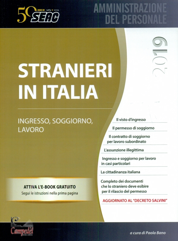 STRANIERI IN ITALIA Di: Paola Bano /ed Pubblicato da SEAC Collana: Amministrazione del personale Il visto d’ingresso Il permesso di soggiorno Il contratto di soggiorno per lavoro subordinato L’assunzione illegittima Ingresso e soggiorno per lavoro in casi particolari La cittadinanza italiana Completo dei documenti che lo straniero deve esibire per il rilascio del permesso. AGGIORNATO AL “DECRETO SALVINI” Il te sto contiene un’analisi delle norme che disciplinano la situazione dei cittadini extracomunitari, contenute nel D.Lgs n. 286/1998 “Testo Unico delle disposizioni concernenti la disciplina dell’immigrazione e norme sulla condizione dello straniero”, e nel DPR n. 394/1999 “Regolamento recante norme di attuazione del Testo Unico delle disposizioni concernenti la disciplina dell’immigrazione e norme sulla condizione dello straniero”. La presente edizione è aggiornata alle ultime disposizioni in mater ia, introdotte con il Decreto Legge n. 113/2018 (c.d. “Decreto Salvini”) entrato in vigore il 5 ottobre 2018, convertito con modificazioni dalla Legge n. 132 del 1° dicembre 2018. In particolare, il testo offre l’analisi dei seguenti aspetti: i principi generali in tema di immigrazione e le tipologie di soggetti interessati (cittadini comunitari, rifugiati, apolidi ed extracomunitari); le modalità di ingresso in Italia, con dettaglio delle tipologie di visto, i requisiti e le condizioni per ottenerlo, nonché i motivi ostativi al rilascio dello stesso; il soggiorno nel territorio dello Stato (rilascio, rinnovo, durata e possibilità di conversione del permesso di soggiorno); l’accesso al mercato del lavoro italiano dei cittadini stranieri e la disciplina del rapporto di lavoro (decreto flussi, Sportello Unico per l’immigrazione, contratto di soggiorno per lavoro subordinato, obblighi assicurativi e previdenziali in capo al datore di lavoro, lavoro stagionale, sanzioni per le assunzioni irregolari); disamina dei principali casi particolari di ingresso in Italia per particolari attività lavorative (sportivi, professionisti, accademici e ricercatori, marittimi, personale artistico, giornalisti, ecc…); la modulistica necessaria per l’ingresso e il lavoro dello straniero in Italia, con specifico riferimento alle diverse ipotesi di ingresso e modalità di rinnovo; le modalità di presentazione della richiesta di cittadinanza italiana. La presente edizione ha lo scopo di fornire nozioni fondamentali per adempiere correttamente alle obbligazioni che precedono e seguono l'ingresso, il soggiorno e la permanenza di un cittadino straniero in Italia. Libreria Campedel Professionisti al vostro servizio | |