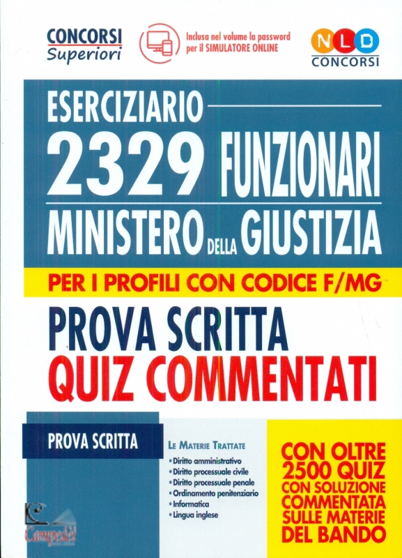 2329 funzionari del Ministero della Giustizia. Eserciziario. Prova scritta. Quiz commentati. Per i profili con codice F/MG. Con software di simulazione pubblicato da Nld Concorsi Collana Concorsi superiori La Commissione Ripam, in data 26 luglio 2019, ha pubblicato il bando di concorso, per titoli ed esami, per 2329 Funzionari del Ministero della Giustizia di cui: 2242 funzionari giudiziari nei ruoli nell'Amministrazione giudiziaria - Codice F/MG; 39 funzionari amministrativi nei ruoli del Dipartimento per la giustizia minorile e di comunità Codice F/MG; 20 funzionari dell'organizzazione e delle relazioni nei ruoli del Dipartimento dell'Amministrazione penitenziaria - Codice F/MG; 28 funzionari dell'organizzazione nei ruoli del Dipartimento per la giustizia minorile e di comunità - Codice FO/MG. Lo svolgimento del concorso prevede: una prova preselettiva; una prova scritta; una prova orale. Gli argomenti della prova scritta, che consisterà i n una serie di domande a risposta multipla, hanno ad oggetto, per i profili con Codice F/MG, il diritto amministrativo, il diritto processuale civile, il diritto processuale penale, l'ordinamento penitenziario L. 354/1975, D.P.R. 230/2000 e D.Lgs. 121/2018, l'informatica e la lingua inglese. Il presente volume di quiz per la preparazione alla prova scritta del Concorso per Funzionario del Ministero della Giustizia per i profili con Codice F/MG rappresenta uno strumento utile per la preparazione, raccogliendo una ricchissima selezione di domande a risposta multipla, che hanno ad oggetto tutte le materie previste dal bando di concorso. Per ciascuna delle sopraindicate materie, sono presenti numerosi quiz a risposta multipla, tutti commentati. I quiz sono stati elaborati sulla base della banca dati del concorso per Assistenti Giudiziari del 2017. Completa il volume il simulatore online con il quale è possibile esercitarsi con batterie di domande a risposta multipla , aventi a oggetto ciascuna delle materie oggetto del volume, consultabile con apposita password presente nel retro del volume. E altresì possibile esercitarsi con il simulatore con i quiz della banca dati del concorso per Assistente giudiziario 2017. Libreria Campedel Professionisti al vostro servizio | |