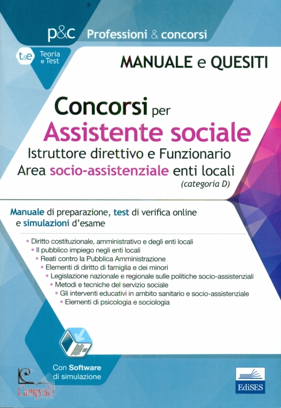 Concorsi per assistente sociale. Istruttore direttivo e Funzionario enti locali. Manuale di preparazione, test di verifica online e simulazioni d'esame. Con software di simulazione pubblicato da Editest Collana Professioni e concorsi Il manuale comprende tutte le materie oggetto delle prove concorsuali, partendo dalle discipline di base (diritto costituzionale, regionale, amministrativo, ordinamento istituzionale e funzioni degli enti locali, pubblico impiego negli enti locali, reati contro la P.A., diritto di famiglia e dei minori) e proseguendo con quelle specialistiche dell'Area socio-assistenziale per i profili professionali indicati (legislazione nazionale e regionale in materia di politiche socio-assistenziali, metodi e tecniche del servizio sociale, interventi educativi in ambito sanitario e socio-assistenziale, elementi di psicologia e sociologia). Ciascuna parte è completata da test a risposta multipla disponibili online nell'apposita sezione riservata del sito, dove troveranno collocazione anche ulteriori materiali di interesse. Libreria Campedel Professionisti al vostro servizio | |