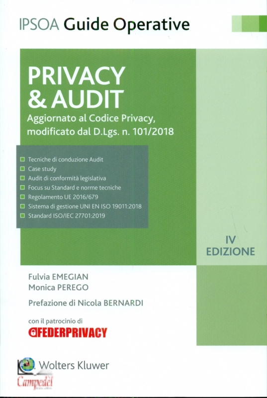 Privacy & Audit di Fulvia Emegian, Monica Perego Editore: Wolters Kluwer Collana:Ipsoa Guide operative Edizione: 4 Data di Pubblicazione: novembre 2019 ll settore della Privacy o della Data protection, come tutte le nuove professioni digitali, richiede competenze giuridiche ed informatiche ma anche organizzative (chi fa cosa?) e di audit (monitoraggio delle varie attività per la compliance privacy). Questa guida operativa raccoglie i processi e le azioni necessari p er riconnettere le informazione raccolte attraverso interviste, questionari, form ecc.. con gli adempimenti e i comportamenti di compliance richiesti ai sensi della nuova disciplina introdotta con il Regolamento Europeo. Infine un’ampia raccolta di case historiy completa la trattazione con pratiche operative di casi già sviluppati. | |