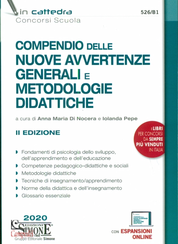 Compendio delle nuove Avvertenze Generali e Metodologie didattiche • Fondamenti di psicologia dello sviluppo, dell'apprendimento e dell'educazione • Competenze pedagogico-didattiche e sociali • Metodoligie didattiche • Tecniche di insegnamento/apprendimento • Norme della didattica e dell'insegnamento • Glossario essenziale - con ESPANSIONI ONLINE A cura di Anna Maria Di Nocera - Iolanda Pepe Pubblicato da Simone Collana :in cattedra Anno Edizione: 2020 Negli ultimi concorsi a cattedra è sempre più sentita l’esigenza di valutare la padronanza da parte degli aspiranti insegnanti non solo delle discipline, ma soprattutto delle competenze didattiche. Non basta, quindi, conoscere alla perfezione le materie di insegnamento ma è sempre più necessario dimostrare di essere capaci di insegnarle nel contesto scuola tenendo conto di tutte le sue innumerevoli variabili. Questo Compendio fornisce a chi si prepara al concorso – e ha poco tempo per farlo – tutti i fondamenti delle tematiche di taglio psico-pedagogico e metodologico didattico richieste dalle cosiddette Avvertenze generali, senza inutili approfondimenti accademici e digressioni teoriche e senza sovrabbondanza di nozioni giuridiche: a tal fine alla trattazione è stato dato un taglio sintetico ma esaustivo e dal forte impatto pratico. Il Compendio si struttura in due parti: • Parte Prima – Fondamenti della psicologia dello sviluppo, della psicologia dell’apprendimento e metodologie didattiche in cui oltre a una sintetica panoramica delle posizioni dei maggiori psicologi dell’età evolutiva e pedagogisti, si dà particolare risalto ai metodi, alle tecniche e agli strumenti della didattica applicata; • Parte Seconda – Legislazione e normativa scolastica con un quadro sintetico delle principali norme che regolano la didattica e la scuola, aggiornato alle ultime novità legislative come il nuovo Ministero dell’Istruzione (D.L. n. 1/2020). Completano il testo il ricco indice analitico, un utile Glossario e numerose espansioni online di approfondimento. A chi si rivolge questo Compendio: • a chi ha poco tempo per studiare; • a chi, avendo approfondito lo studio su vari testi, appunti e altri materiali vuole una visione organica e sintetica di quanto studiato; • a chi avendo già studiato in passato alcuni argomenti, ora vuole solo ripassarli prima del concorso; • a chi già insegna a scuola, ma in previsione delle prove di concorso, vuole dare un inquadramento teorico alla sua esperienza didattica. Libreria Campèdel Professionisti al vostro servizio | |