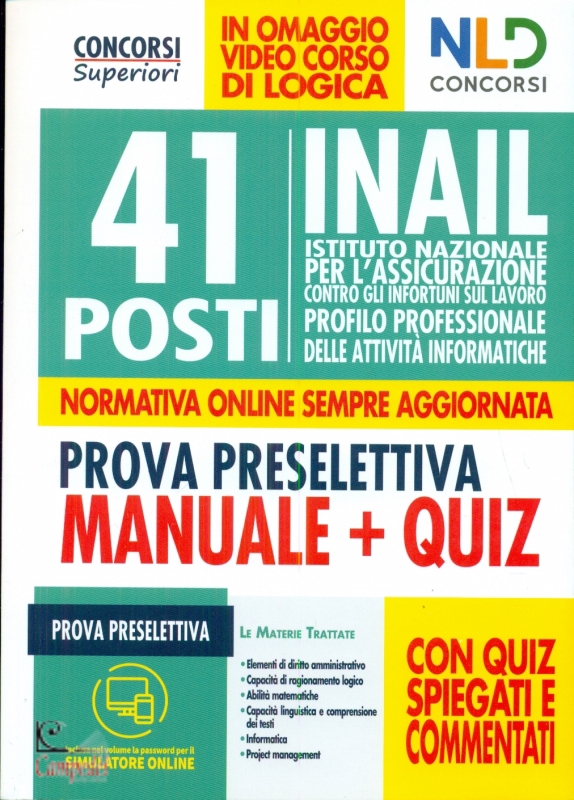 41 posti INAIL profilo professionale delle attività informatiche. Manuale + Quiz per la prova preselettiva Editore: Nld Concorsi Collana: Concorsi superiori Il volume sostiene il candidato nella preparazione alle prove preselettive che si sostanzieranno in una serie di quesiti a risposta multipla finalizzati ad accertare la presenza di capacità di base rispetto a: elementi di diritto amministrativo; capacità di ragionamento logico; abilità matematiche; capacità linguistica e comprensione dei testi; informatica; project management. Per ciascuna materia, vengono infatti trattate in maniera chiara ed esaustiva le nozioni teoriche, in modo tale da fornire al candidato la possibilità di apprendere i concetti e di ripassare velocemente i contenuti oggetto di studio. Abbinata alla teoria è presente una sezione dedicata alle batterie di domande a risposta multipla tutte commentate e spiegate. Il Volume è comprensivo di password per accedere al simulatore, inoltre è previsto l'aggiornamento continuo della normativa. Materie presenti: Elementi di diritto amministrativo Capacità di ragionamento logico Abilità matematiche Capacità linguistica e comprensione dei testi Informatica Project management. Libreria Campedèl Professionisti al vostro servizio | |