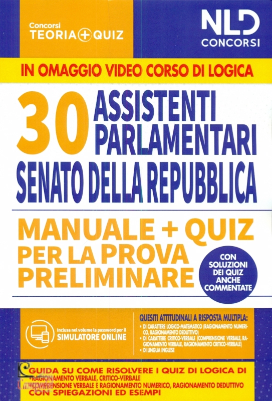Concorso 30 assistenti parlamentari al Senato della Repubblica. Manuale e quiz per la prova preliminare. Con software di simulazione Editore: Nld Concorsi Collana: Concorsi. Teoria + quiz Data di Pubblicazione: gennaio 2020 Il volume sostiene il candidato nella preparazione alla prova preliminare del concorso per 30 assistenti parlamentari. Il presente volume contiene una disamina delle materie concorsuali, nonché un'ampia gamma di quesiti a risposta multipla, tutti commentati e suddivisi per materia per consentire al candidato di esercitarsi. Sul retro del volume è disponibile una password di accesso al Simulatore per esercitarsi online. Materie presenti: quesiti attitudinali a risposta multipla di carattere logico-matematico (ragionamento numerico,ragionamento deduttivo), di carattere critico-verbale (comprensione verbale, ragionamento verbale, ragionamento critico-verbale) di lingua inglese. Libreria Campedèl Professionisti al vostro servizio | |