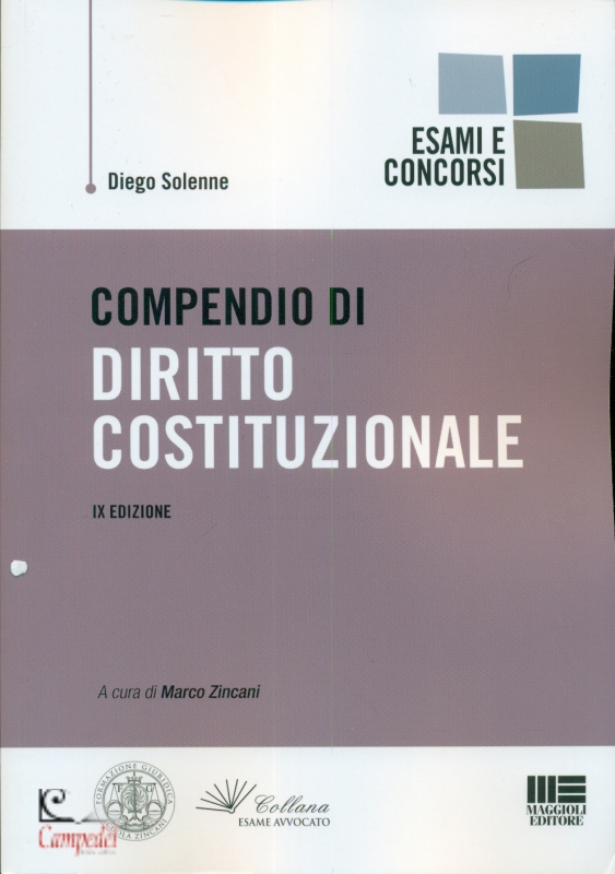 Compendio di Diritto Costituzionale Di: Diego Solenne Editore Maggioli Editore Collana Esami e Professioni – Esame avvocato Il testo affronta il diritto costituzionale a 360 gradi, con un linguaggio tecnico ma fluido, funzionale alla preparazione di concorsi ed esami. L’opera è aggiornata alla legge di revisione costituzionale dell’8 ottobre 2019, in materia di riduzione del numero dei parlamentari. Libri consigliati Compendio di procedura civile Compendio di diritto penale Compendio di procedura penale Compendio di diritto penale Libreria Campedèl Professionisti al vostro servizio | |