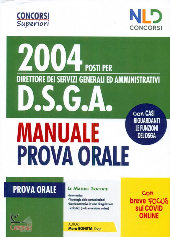 Concorso 2004 posti per DSGA Direttore dei servizi generali ed amministrativi. Manuale per la prova orale Editore: Nld Concorsi Collana: Concorsi superiori Data di Pubblicazione: giugno 2020 Prova orale Le materie trattate - Informatica - Tecnologia delle informazioni - Novità normative in tema di legislazione scolastica ( nella estensione on line) - Breve focus su Covid on line - Libreria Campedèl | |