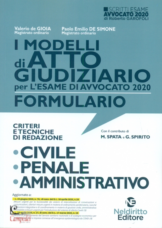 I modelli di atto giudiziario per l'esame di avvocato 2020. Formulario. Criteri e tecniche di redazione. Civile-Penale-Amministrativo di V. De Gioia, P. E. De Simone (a cura di) Editore: Neldiritto Editore Collana: Scritti esame avvocato A cura di: V. De Gioia, P. E. De Simone Il volume, con il suo formato pratico e versatile, rappresenta uno strumento utile per poter apprendere le tecniche di redazione degli atti giudiziari sia in materia civile che penale ed amministrativo. All'interno del volume, infatti, vi è una attenta selezione di atti esplicando in maniera precisa le tecniche di risoluzione. Libreria Campedèl | |
